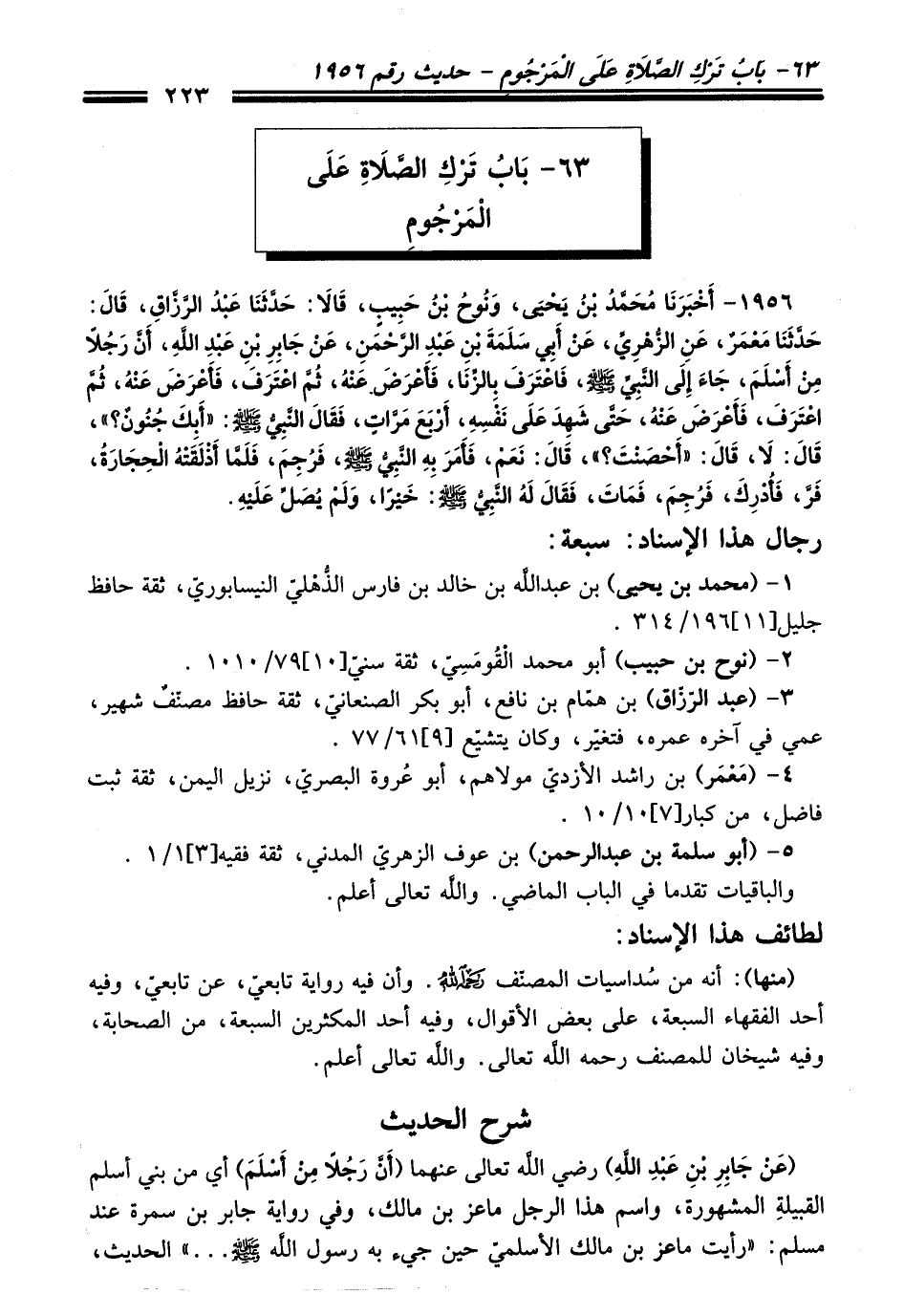 1956 - أَخْبَرَنَا مُحَمَّدُ بْنُ يَحْيَى, وَنُوحُ بْنُ حَبِيبٍ, قَالاَ: حَدَّثَنَا عَبْدُ الرَّزَّاقِ, قَالَ: حَدَّثَنَا مَعْمَرٌ, عَنِ الزُّهْرِيِّ, عَنْ أَبِي سَلَمَةَ بْنِ عَبْدِ الرَّحْمَنِ, عَنْ جَابِرِ بْنِ عَبْدِ اللَّهِ, أَنَّ رَجُلاً مِنْ أَسْلَمَ, جَاءَ إِلَى النَّبِيِّ - صلى اللَّه عليه وسلم -, فَاعْتَرَفَ بِالزِّنَا, فَأَعْرَضَ عَنْهُ, ثُمَّ اعْتَرَفَ, فَأَعْرَضَ عَنْهُ, ثُمَّ اعْتَرَفَ, فَأَعْرَضَ عَنْهُ, حَتَّى شَهِدَ عَلَى نَفْسِهِ, أَرْبَعَ مَرَّاتٍ, فَقَالَ النَّبِيُّ - صلى اللَّه عليه وسلم -: «أَبِكَ جُنُونٌ؟» , قَالَ: لاَ. قَالَ: «أَحْصَنْتَ؟». قَالَ: نَعَمْ, فَأَمَرَ بِهِ النَّبِيُّ - صلى اللَّه عليه وسلم -, فَرُجِمَ, فَلَمَّا أَذْلَقَتْهُ الْحِجَارَةُ, فَرَّ, فَأُدْرِكَ, فَرُجِمَ, فَمَاتَ, فَقَالَ لَهُ النَّبِيُّ - صلى اللَّه عليه وسلم -: خَيْرًا, وَلَمْ يُصَلِّ عَلَيْهِ.