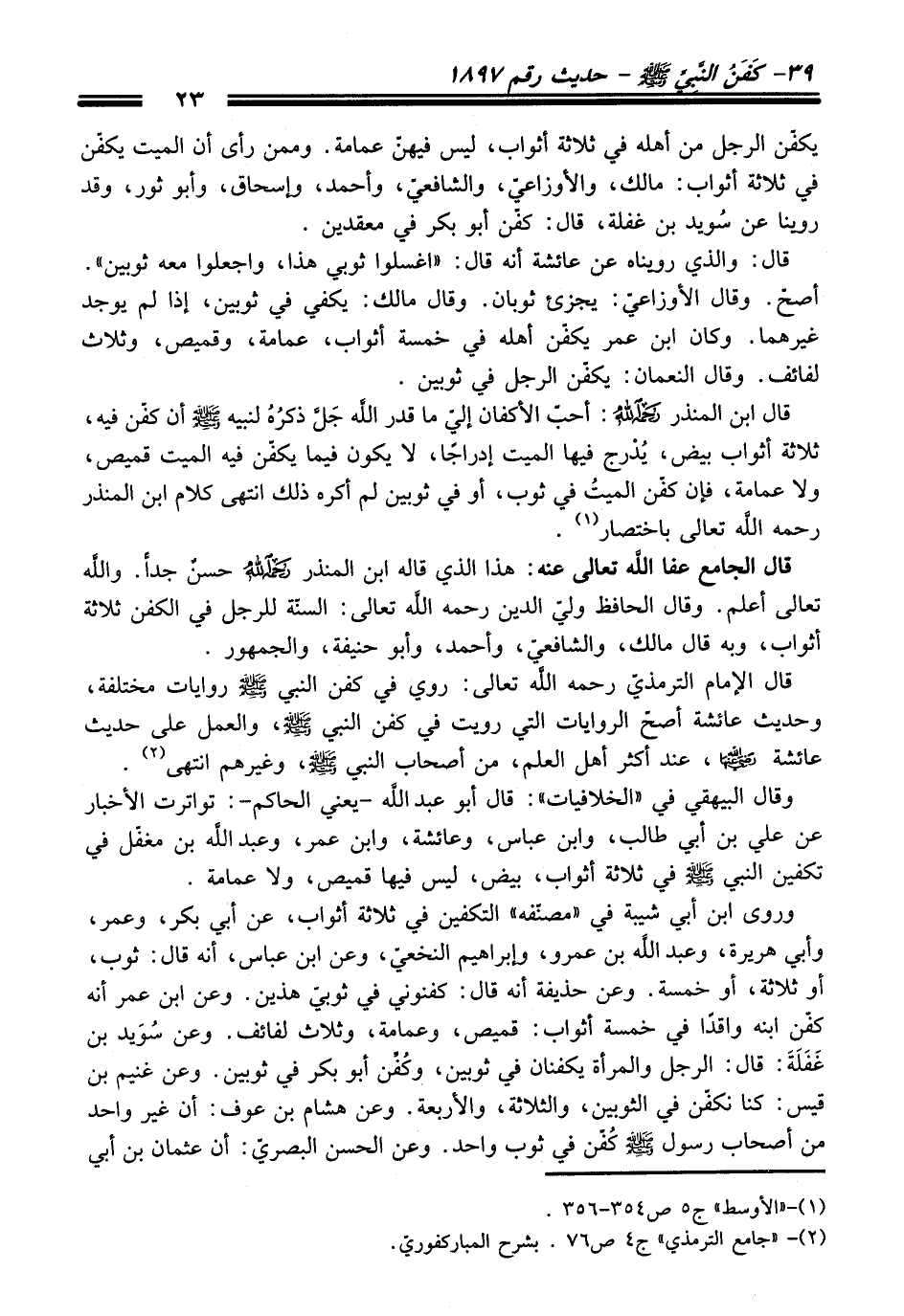 قال الإمام الترمذيّ -رحمه اللَّه تعالى-: روي في كفن النبي - صلى اللَّه عليه وسلم - روايات مختلفة، وحديث عائشة أصحّ الروايات التي رويت في كفن النبي - صلى اللَّه عليه وسلم -، والعمل على حديث عائشة - رضي اللَّه عنها -، عند أكثر أهل العلم، من أصحاب النبي - صلى اللَّه عليه وسلم -، وغيرهم انتهى (¬2).