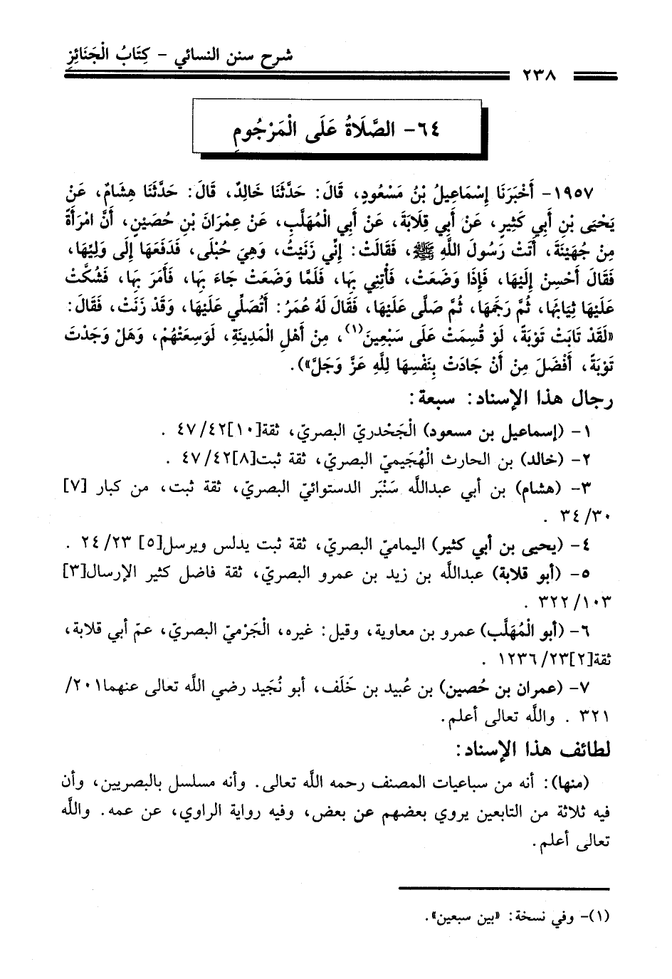 1957 - (أَخْبَرَنَا إِسْمَاعِيلُ بْنُ مَسْعُودٍ, قَالَ: حَدَّثَنَا خَالِدٌ, قَالَ: حَدَّثَنَا هِشَامٌ, عَنْ يَحْيَى بْنِ أَبِي كَثِيرٍ, عَنْ أَبِي قِلاَبَةَ, عَنْ أَبِي الْمُهَلَّبِ, عَنْ عِمْرَانَ بْنِ حُصَيْنٍ, أَنَّ امْرَأَةً مِنْ جُهَيْنَةَ, أَتَتْ رَسُولَ اللَّهِ - صلى اللَّه عليه وسلم -, فَقَالَتْ: إِنِّي زَنَيْتُ, وَهِيَ حُبْلَى, فَدَفَعَهَا إِلَى وَلِيِّهَا, فَقَالَ أَحْسِنْ إِلَيْهَا, فَإِذَا وَضَعَتْ, فَائْتِنِي بِهَا, فَلَمَّا وَضَعَتْ جَاءَ بِهَا, فَأَمَرَ بِهَا, فَشُكَّتْ عَلَيْهَا ثِيَابُهَا, ثُمَّ رَجَمَهَا, ثُمَّ صَلَّى عَلَيْهَا, فَقَالَ لَهُ عُمَرُ: أَتُصَلِّى عَلَيْهَا, وَقَدْ زَنَتْ, فَقَالَ: «لَقَدْ تَابَتْ تَوْبَةً, لَوْ قُسِمَتْ بَيْنَ سَبْعِينَ (¬1) , مِنْ أَهْلِ الْمَدِينَةِ, لَوَسِعَتْهُمْ, وَهَلْ وَجَدْتَ تَوْبَةً, أَفْضَلَ مِنْ أَنْ جَادَتْ بِنَفْسِهَا لِلَّهِ -عَزَّ وَجَلَّ-»).