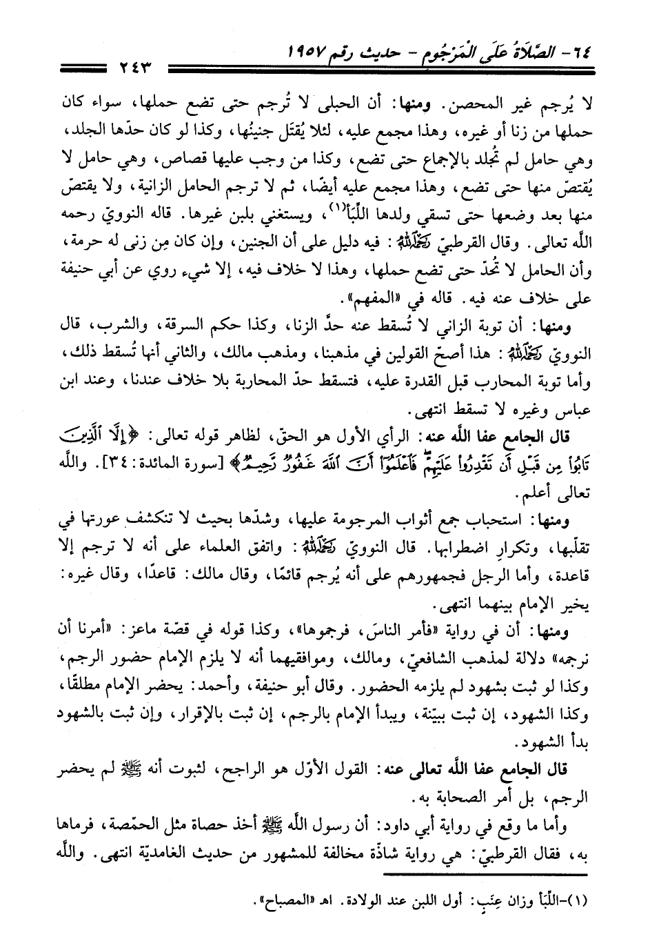 لا يُرجم غير المحصن. ومنها: أن الحبلى لا تُرجم حتى تضع حملها، سواء كان حملها من زنا أو غيره، وهذا مجمع عليه، لئلا يُقتَل جنينُها، وكذا لو كان حدّها الجلد، وهي حامل لم تُجلد بالإجماع حتى تضع، وكذا من وجب عليها قصاص، وهي حامل لا يُقتصّ منها حتى تضع، وهذا مجمع عليه أيضًا، ثم لا ترجم الحامل الزانية، ولا يقتصّ منها بعد وضعها حتى تسقي ولدها اللِّبَأ (¬1)، ويستغني بلبن غيرها. قاله النوويّ -رَحِمَهُ اللَّهُ تَعَالَى-. وقال القرطبيّ -رَحِمَهُ اللَّهُ-: فيه دليل على أن الجنين، وإن كان مِن زنى له حرمة، وأن الحامل لا تحُدّ حتى تضع حملها، وهذا لا خلاف فيه، إلا شيء روي عن أبي حنيفة على خلاف عنه فيه. قاله في "المفهم".