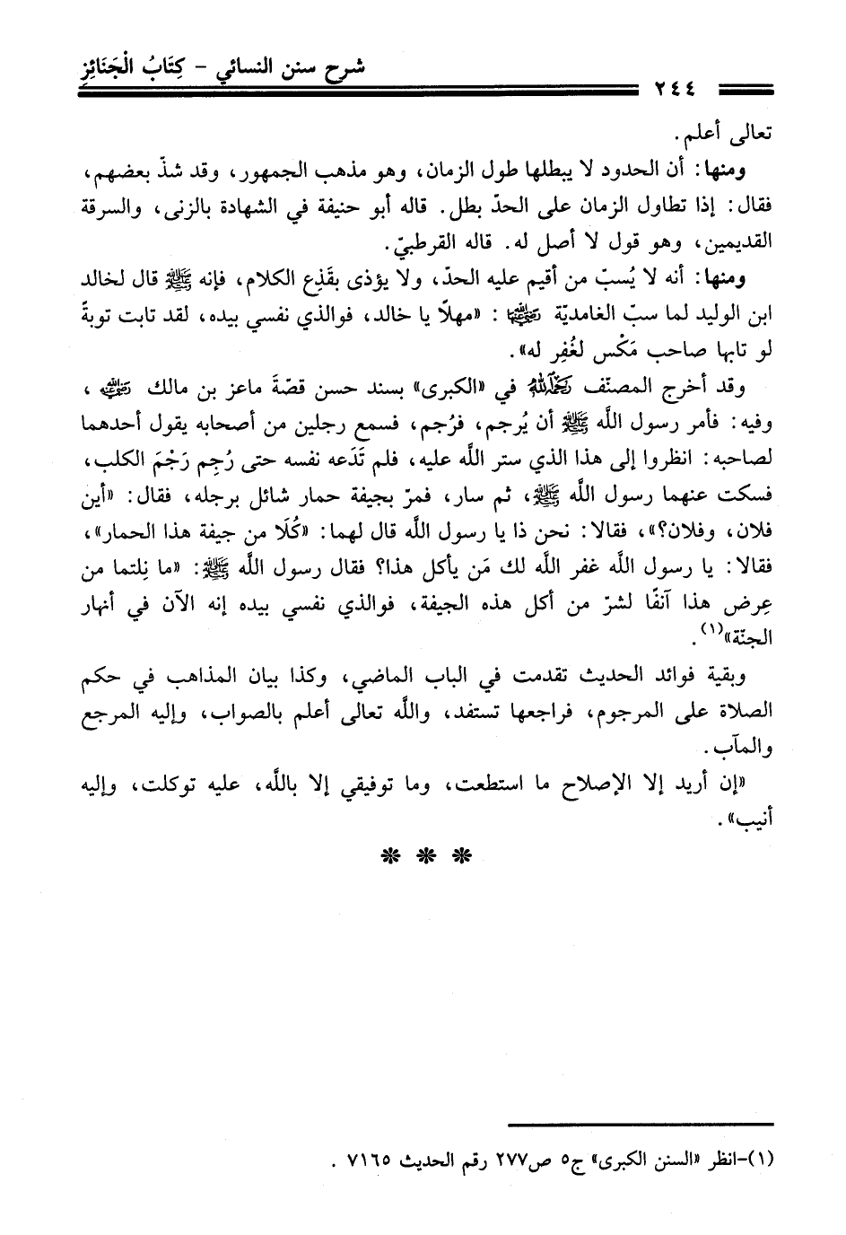 وقد أخرج المصنّف -رَحِمَهُ اللَّهُ- في "الكبرى" بسند حسن قصّةَ ماعز بن مالك - رضي اللَّه عنه -، وفيه: فأمر رسول اللَّه - صلى اللَّه عليه وسلم - أن يُرجم، فرُجم، فسمع رجلين من أصحابه يقول أحدهما لصاحبه: انظروا إلى هذا الذي ستر اللَّه عليه، فلم تَدَعه نفسه حتى رُجِم رَجْمَ الكلب، فسكت عنهما رسول اللَّه - صلى اللَّه عليه وسلم -، ثم سار، فمرّ بجيفة حمار شائل برجله، فقال: "أين فلان، وفلان؟ "، فقالا: نحن ذا يا رسول اللَّه قال لهما: "كُلَا من جيفة هذا الحمار"، فقالا: يا رسول اللَّه غفر اللَّه لك مَن يأكل هذا؟ فقال رسول اللَّه - صلى اللَّه عليه وسلم -: "ما نِلتما من عِرض هذا آنفًا لشرّ من أكل هذه الجيفة، فوالذي نفسي بيده إنه الآن في أنهار الجنّة" (¬1).