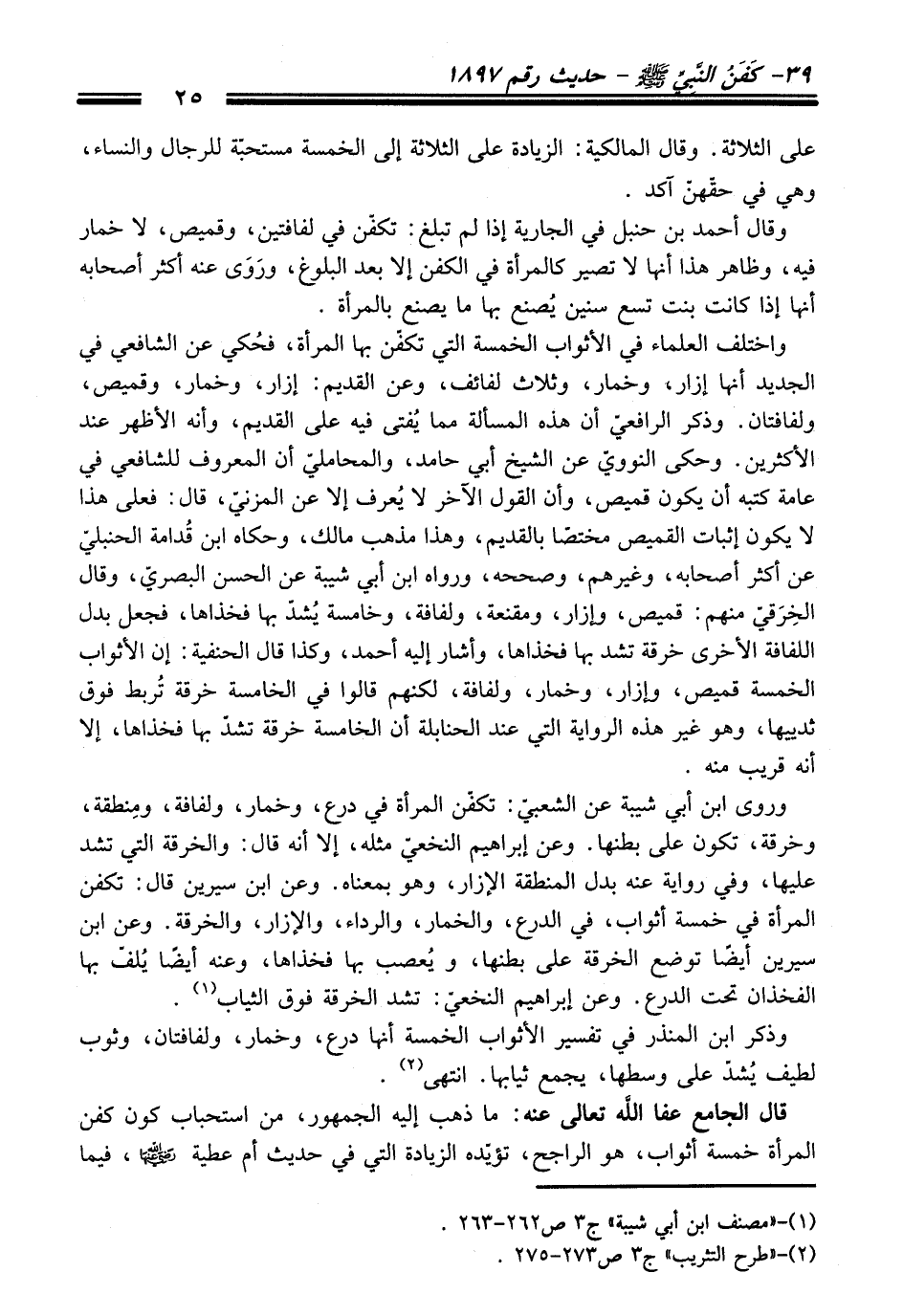 قال الجامع - عفا اللَّه تعالى عنه -: ما ذهب إليه الجمهور، من استحباب كون كفن المرأة خمسة أثواب، هو الراجح، تؤيّده الزيادة التي في حديث أم عطية - رضي اللَّه عنها -، فيما