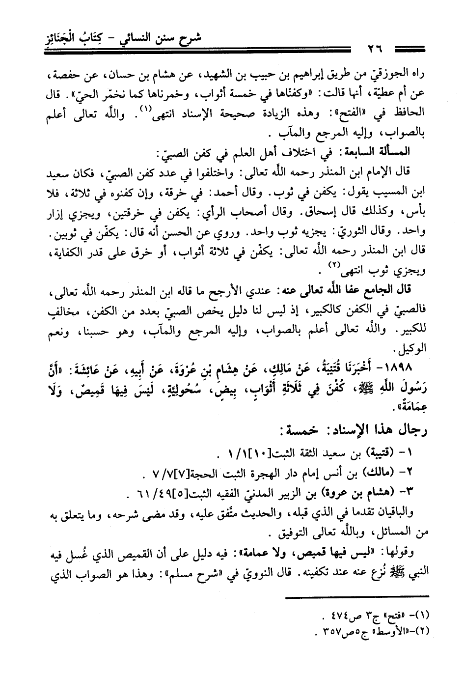 1898 - أَخْبَرَنَا قُتَيْبَةُ, عَنْ مَالِكٍ, عَنْ هِشَامِ بْنِ عُرْوَةَ, عَنْ أَبِيهِ, عَنْ عَائِشَةَ: "أَنَّ رَسُولَ اللَّهِ - صلى اللَّه عليه وسلم -, كُفِّنَ فِي ثَلاَثَةِ أَثْوَابٍ, بِيضٍ, سُحُولِيَّةٍ, لَيْسَ فِيهَا قَمِيصٌ, وَلاَ عِمَامَةٌ".