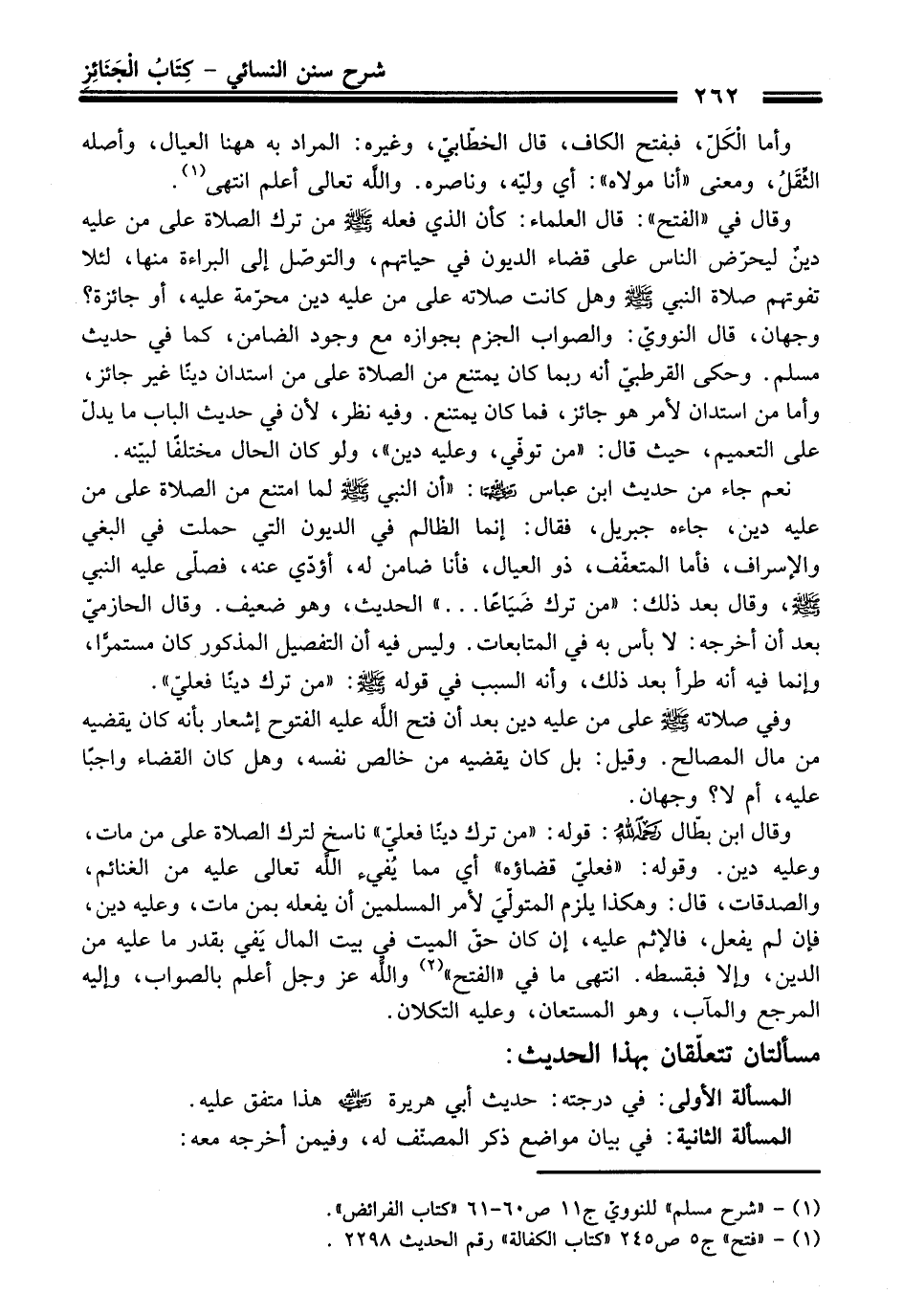 وقال في "الفتح": قال العلماء: كان الذي فعله - صلى اللَّه عليه وسلم - من ترك الصلاة على من عليه دينٌ ليحرّض الناس على قضاء الديون في حياتهم، والتوصّل إلى البراءة منها، لئلا تفوتهم صلاة النبي - صلى اللَّه عليه وسلم - وهل كانت صلاته على من عليه دين محرّمة عليه، أو جائزة؟ وجهان، قال النوويّ: والصواب الجزم بجوازه مع وجود الضامن، كما في حديث مسلم. وحكى القرطبيّ أنه ربما كان يمتنع من الصلاة على من استدان دينًا غير جائز، وأما من استدان لأمر هو جائز، فما كان يمتنع. وفيه نظر، لأن في حديث الباب ما يدلّ على التعميم، حيث قال: "من توفّي، وعليه دين"، ولو كان الحال مختلفًا لبيّنه.
