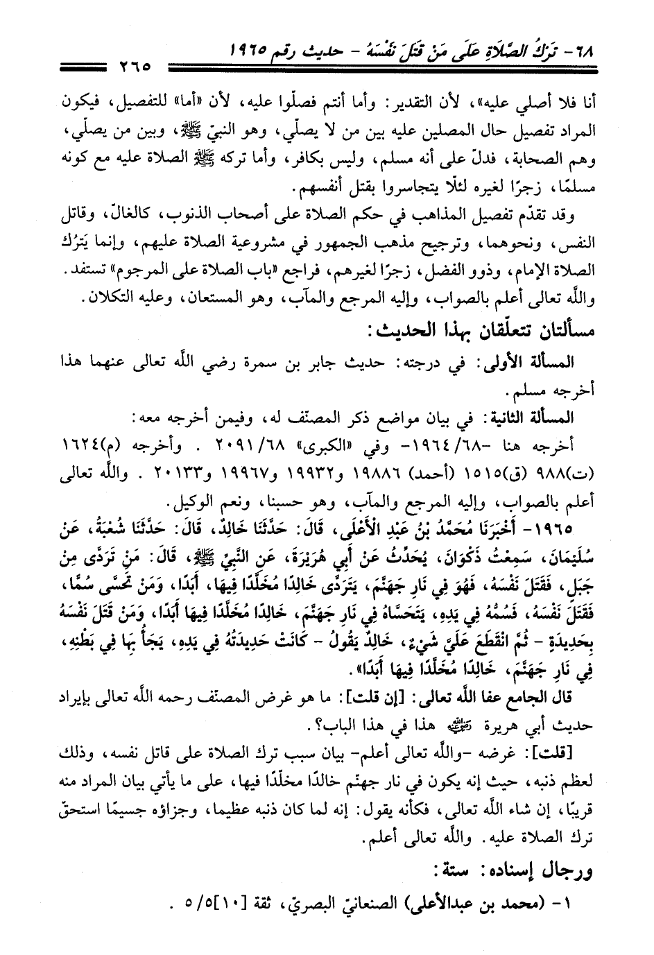 1965 - أَخْبَرَنَا مُحَمَّدُ بْنُ عَبْدِ الأَعْلَى, قَالَ: حَدَّثَنَا خَالِدٌ, قَالَ: حَدَّثَنَا شُعْبَةُ, عَنْ سُلَيْمَانَ, سَمِعْتُ ذَكْوَانَ, يُحَدِّثُ عَنْ أَبِي هُرَيْرَةَ, عَنِ النَّبِيِّ - صلى اللَّه عليه وسلم -, قَالَ: مَنْ تَرَدَّى مِنْ جَبَلٍ, فَقَتَلَ نَفْسَهُ, فَهُوَ فِي نَارِ جَهَنَّمَ, يَتَرَدَّى خَالِدًا مُخَلَّدًا فِيهَا, أَبَدًا وَمَنْ تَحَسَّى سُمًّا فَقَتَلَ نَفْسَهُ فَسُمُّهُ فِي يَدِهِ يَتَحَسَّاهُ فِي نَارِ جَهَنَّمَ خَالِدًا مُخَلَّدًا فِيهَا, أَبَدًا, وَمَنْ قَتَلَ نَفْسَهُ بِحَدِيدَةٍ -ثُمَّ انْقَطَعَ عَلَيَّ شَيْءٌ, خَالِدٌ يَقُولُ - كَانَتْ حَدِيدَتُهُ فِي يَدِهِ, يَجَأُ بِهَا فِي بَطْنِهِ, فِي نَارِ جَهَنَّمَ, خَالِدًا مُخَلَّدًا فِيهَا أَبَدًا».