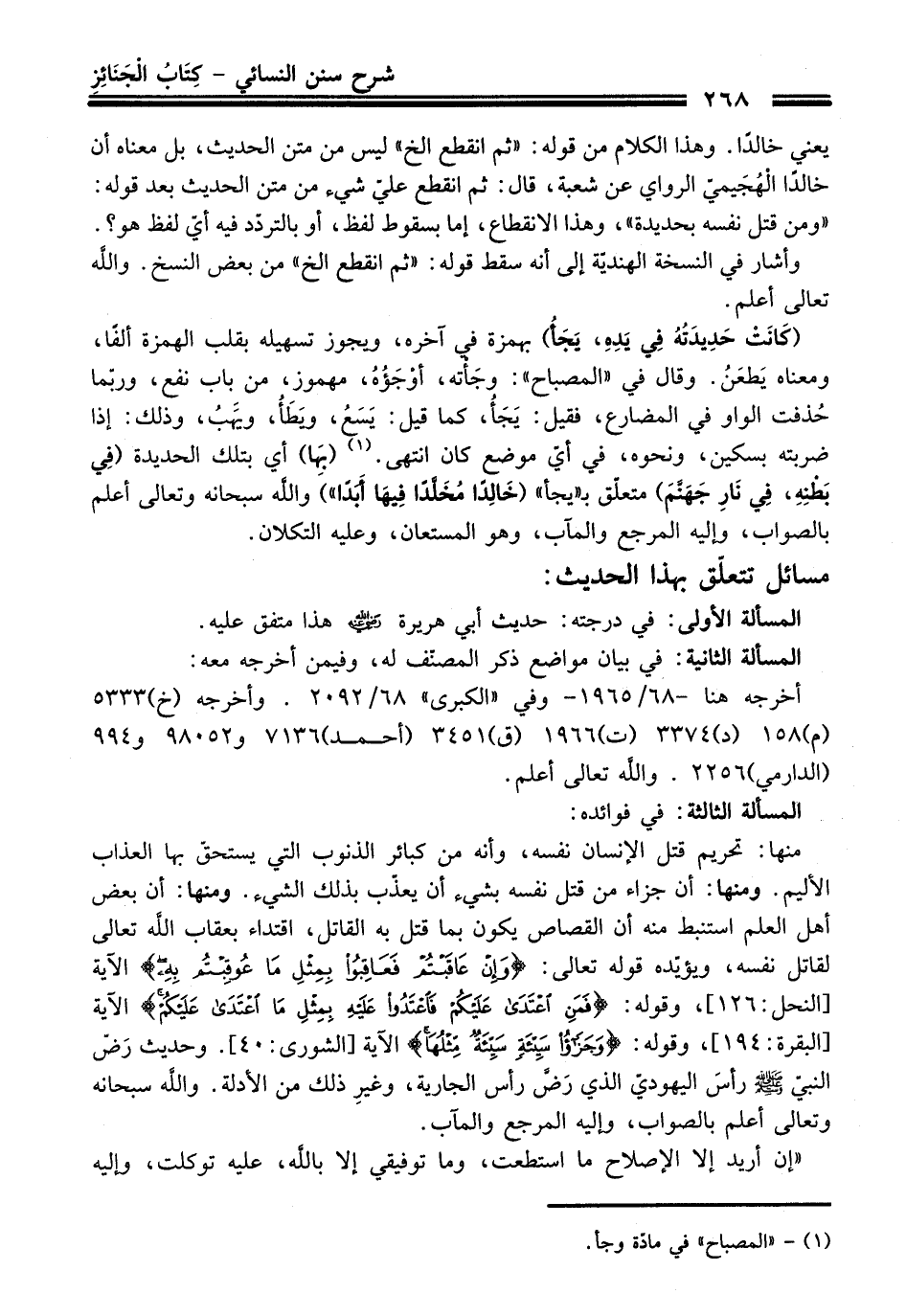 (كَانَتْ حَدِيدَتُهُ فِي يَدِهِ، يَجَأُ) بهمزة في آخره، ويجوز تسهيله بقلب الهمزة ألفًا، ومعناه يَطعَنُ. وقال في "المصباح": وجَأته، أوْجَؤُهُ، مهموز، من باب نفع، وربّما حُذفت الواو في المضارع، فقيل: يَجَأُ، كما قيل: يَسَعُ، ويَطَأُ، ويَهَبُ، وذلك: إذا ضربته بسكين، ونحوه، في أيّ موضع كان انتهى. (¬1) (بِهَا) أي بتلك الحديدة (فِي بَطْنِهِ، فِي نَارِ جَهَنَّمَ) متعلّق بـ "يجأ" (خَالِدًا مُخَلَّدًا فِيهَا أَبَدَا") واللَّه سبحانه وتعالى أعلم بالصواب، وإليه المرجع والمآب، وهو المستعان، وعليه التكلان.