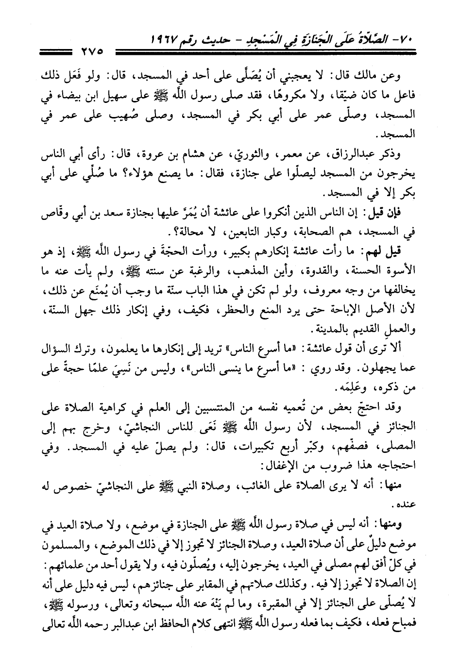 وذكر عبدالرزاق، عن معمر، والثوريّ، عن هشام بن عروة، قال: رأى أبي الناس يخرجون من المسجد ليصلّوا على جنازة، فقال: ما يصنع هؤلاء؟ ما صُلِّي على أبي بكر إلا في المسجد.