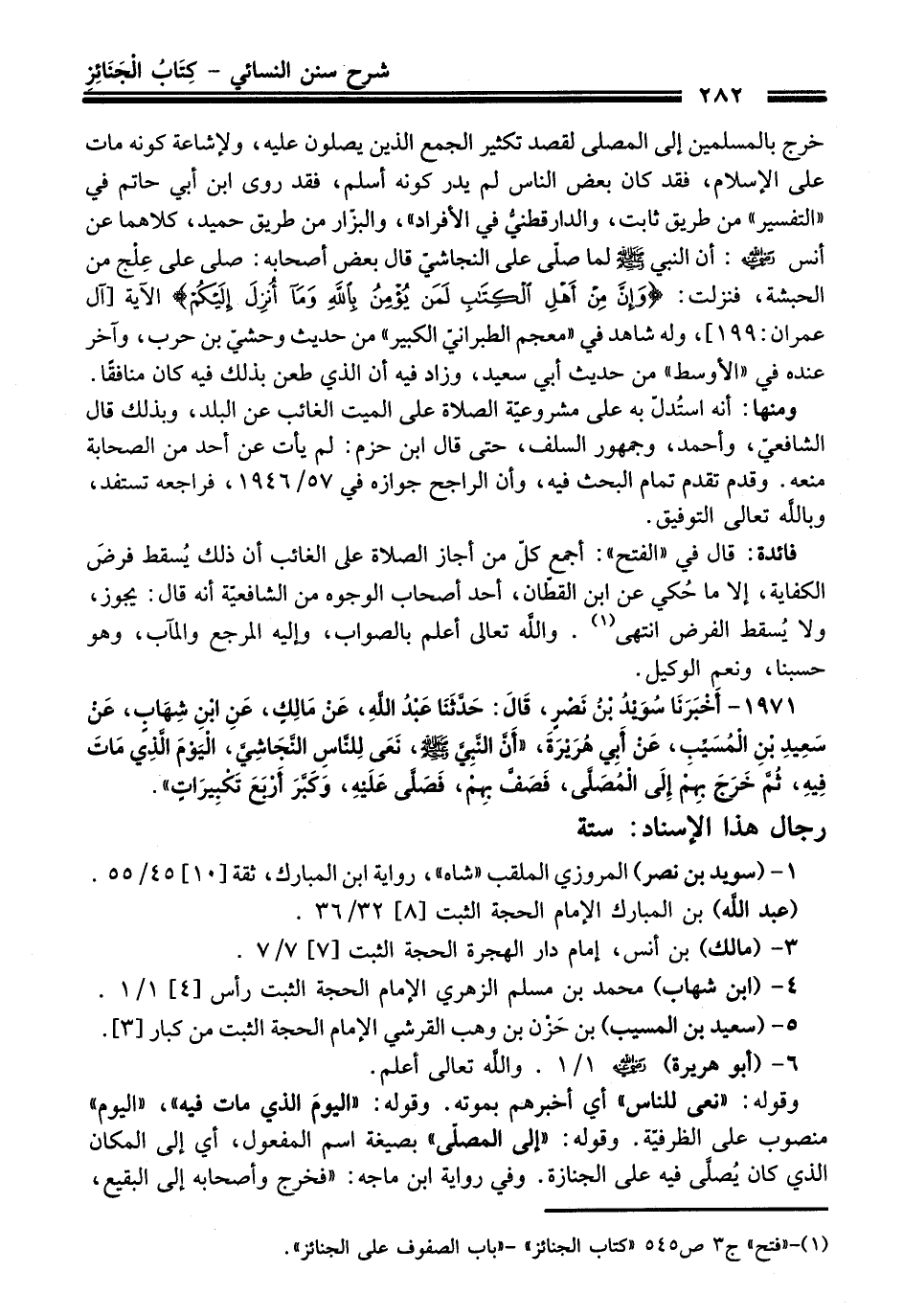 1971 - أَخْبَرَنَا سُوَيْدُ بْنُ نَصْرٍ, قَالَ: حَدَّثَنَا عَبْدُ اللَّهِ, عَنْ مَالِكٍ, عَنِ ابْنِ شِهَابٍ, عَنْ سَعِيدِ بْنِ الْمُسَيَّبِ, عَنْ أَبِي هُرَيْرَةَ, "أَنَّ النَّبِيَّ - صلى اللَّه عليه وسلم -, نَعَى لِلنَّاسِ النَّجَاشِيَّ, الْيَوْمَ الَّذِي مَاتَ فِيهِ, ثُمَّ خَرَجَ بِهِمْ إِلَى الْمُصَلَّى, فَصَفَّ بِهِمْ, فَصَلَّى عَلَيْهِ, وَكَبَّرَ أَرْبَعَ تَكْبِيرَاتٍ".