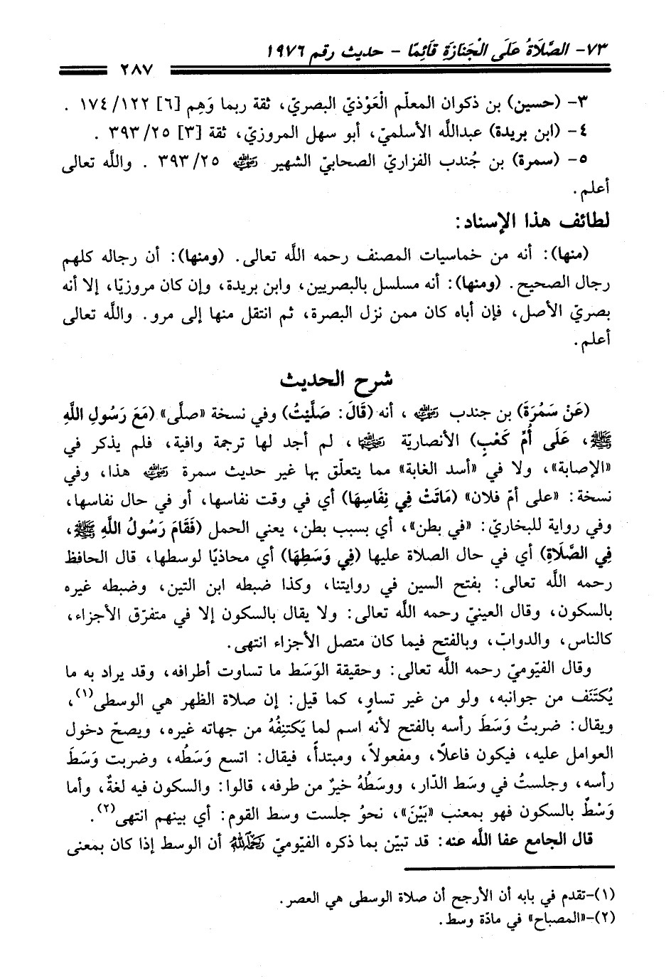 (عَنْ سَمُرَةَ) بن جندب - رضي اللَّه عنه -، أنه (قَالَ: صَلَّيْتُ) وفي نسخة "صلَّى" (مَعَ رَسُولِ اللَّهِ - صلى اللَّه عليه وسلم -، عَلَى أُمِّ كَعْبٍ) الأنصاريّة - رضي اللَّه عنها -، لم أجد لها ترجمة وافية، فلم يذكر في "الإصابة"، ولا في "أسد الغابة" مما يتعلّق بها غير حديث سمرة - رضي اللَّه عنه - هذا، وفي نسخة: "على أمّ فلان" (مَاتَتْ فِي نِفَاسِهَا) أي في وقت نفاسها، أو في حال نفاسها، وفي رواية للبخاريّ: "في بطن"، أي بسبب بطن، يعني الحمل (فَقَامَ رَسُولُ اللَّهِ - صلى اللَّه عليه وسلم -، فِي الصَّلَاةِ) أي في حال الصلاة عليها (فِي وَسَطِهَا) أي محاذيًا لوسطها، قال الحافظ -رَحِمَهُ اللَّهُ تَعَالَى-: بفتح السين في روايتنا، وكذا ضبطه ابن التين، وضبطه غيره بالسكون، وقال العينيّ -رَحِمَهُ اللَّهُ تَعَالَى-: ولا يقال بالسكون إلا في متفرّق الأجزاء، كالناس، والدوابّ، وبالفتح فيما كان متصل الأجزاء انتهى.