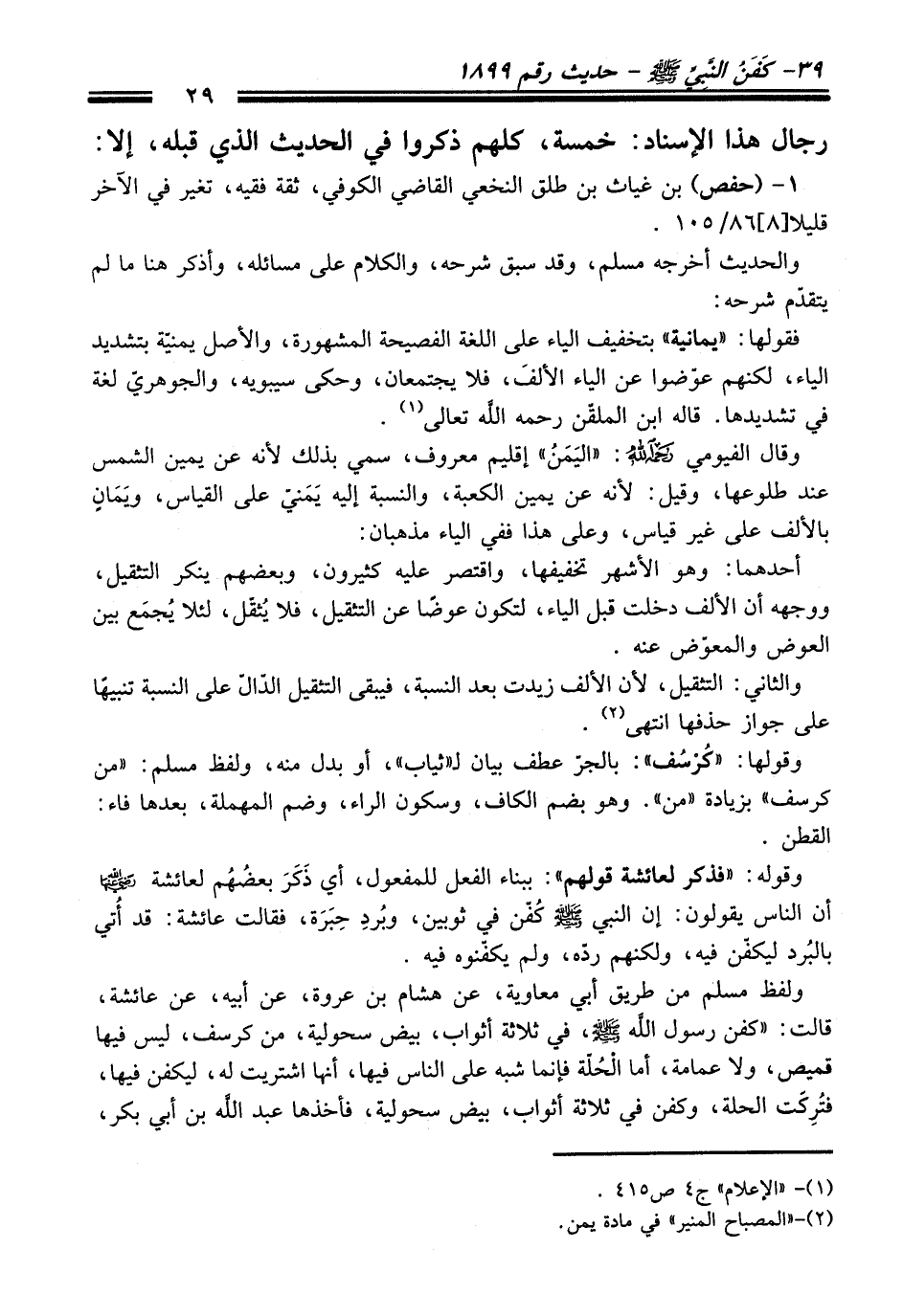 ولفظ مسلم من طريق أبي معاوية، عن هشام بن عروة، عن أبيه، عن عائشة، قالت: "كفن رسول اللَّه - صلى اللَّه عليه وسلم -، في ثلاثة أثواب، بيض سحولية، من كرسف، ليس فيها قميص، ولا عمامة، أما الْحُلّة فإنما شبه على الناس فيها، أنها اشتريت له، ليكفن فيها، فتُرِكَت الحلة، وكفن في ثلاثة أثواب، بيض سحولية، فأخذها عبد اللَّه بن أبي بكر،