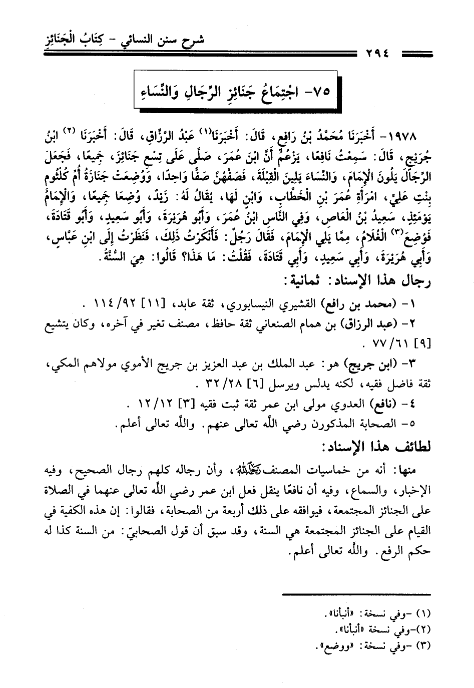 1978 - أَخْبَرَنَا مُحَمَّدُ بْنُ رَافِعٍ, قَالَ: أَخْبَرَنَا (¬1) عَبْدُ الرَّزَّاقِ, قَالَ: أَخْبَرَنَا (¬2) ابْنُ جُرَيْجٍ, قَالَ: سَمِعْتُ نَافِعًا, يَزْعُمُ أَنَّ ابْنَ عُمَرَ, صَلَّى عَلَى تِسْعِ جَنَائِزَ, جَمِيعًا, فَجَعَلَ الرِّجَالَ يَلُونَ الإِمَامَ, وَالنِّسَاءَ يَلِينَ الْقِبْلَةَ, فَصَفَّهُنَّ صَفًّا وَاحِدًا, وَوُضِعَتْ جَنَازَةُ أُمِّ كُلْثُومٍ بِنْتِ عَلِيٍّ, امْرَأَةِ عُمَرَ بْنِ الْخَطَّابِ, وَابْنٍ لَهَا, يُقَالُ لَهُ: زَيْدٌ وُضِعَا جَمِيعًا, وَالإِمَامُ يَوْمَئِذٍ, سَعِيدُ بْنُ الْعَاصِ, وَفِي النَّاسِ ابْنُ عُمَرَ, وَأَبُو هُرَيْرَةَ, وَأَبُو سَعِيدٍ, وَأَبُو قَتَادَةَ, فَوُضِعَ (¬3) الْغُلاَمُ, مِمَّا يَلِى الإِمَامَ, فَقَالَ رَجُلٌ: فَأَنْكَرْتُ ذَلِكَ, فَنَظَرْتُ إِلَى ابْنِ عَبَّاسٍ, وَأَبِي هُرَيْرَةَ, وَأَبِي سَعِيدٍ, وَأَبِي قَتَادَةَ, فَقُلْتُ: مَا هَذَا؟ قَالُوا: هِيَ السُّنَّةُ.