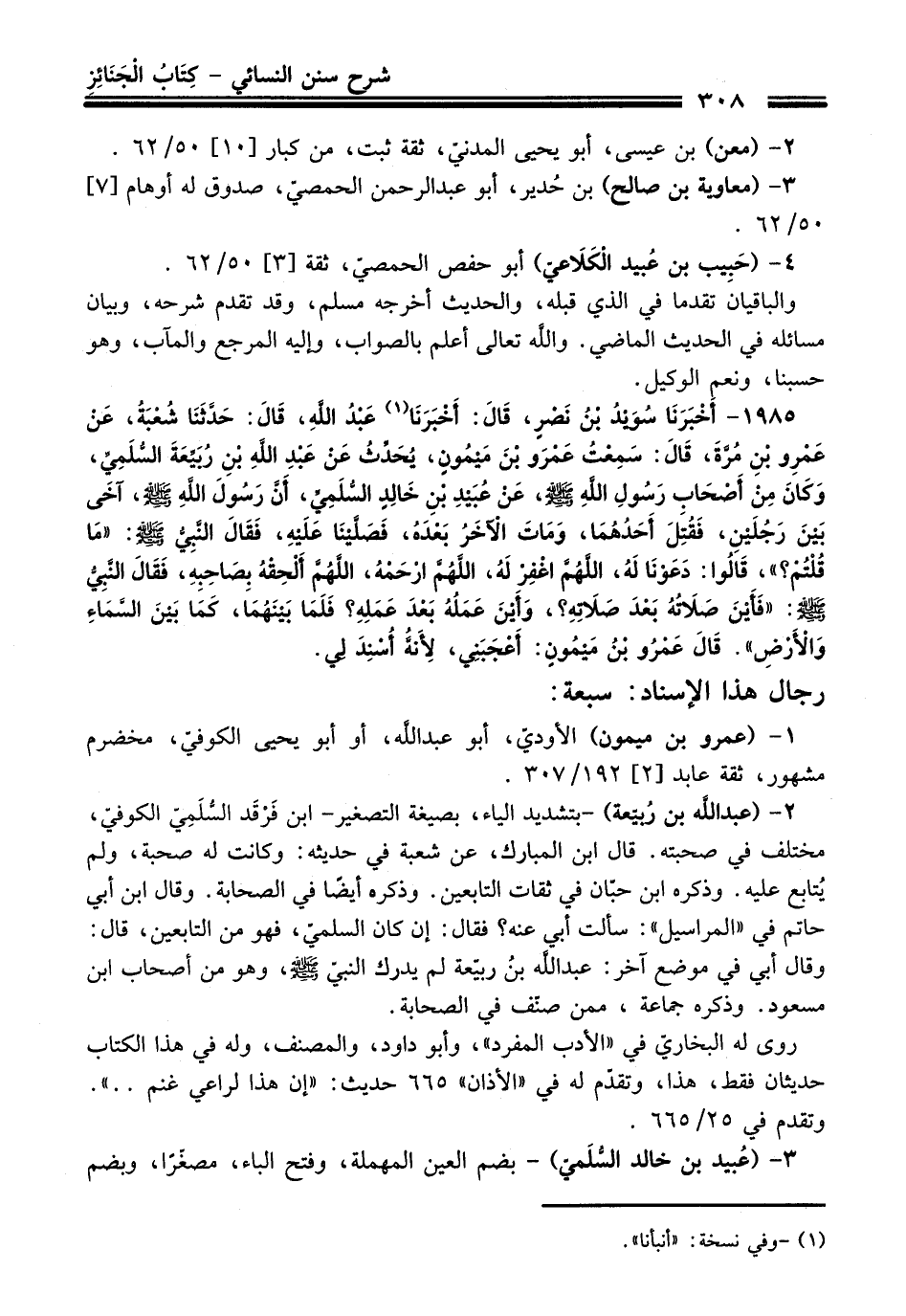 1985 - أَخْبَرَنَا سُوَيْدُ بْنُ نَصْرٍ, قَالَ: أَخْبَرَنَا (¬1) عَبْدُ اللَّهِ, قَالَ: حَدَّثَنَا شُعْبَةُ, عَنْ عَمْرِو بْنِ مُرَّةَ, قَالَ: سَمِعْتُ عَمْرَو بْنَ مَيْمُونٍ, يُحَدِّثُ عَنْ عَبْدِ اللَّهِ بْنِ رُبَيِّعَةَ السُّلَمِيِّ, وَكَانَ مِنْ أَصْحَابِ رَسُولِ اللَّهِ - صلى اللَّه عليه وسلم -, عَنْ عُبَيْدِ بْنِ خَالِدٍ السُّلَمِيِّ, أَنَّ رَسُولَ اللَّهِ - صلى اللَّه عليه وسلم -, آخَى بَيْنَ رَجُلَيْنِ, فَقُتِلَ أَحَدُهُمَا, وَمَاتَ الآخَرُ بَعْدَهُ, فَصَلَّيْنَا عَلَيْهِ, فَقَالَ النَّبِيُّ - صلى اللَّه عليه وسلم -: «مَا قُلْتُمْ؟» , قَالُوا: دَعَوْنَا لَهُ, اللَّهُمَّ اغْفِرْ لَهُ, اللَّهُمَّ ارْحَمْهُ, اللَّهُمَّ أَلْحِقْهُ بِصَاحِبِهِ, فَقَالَ النَّبِيُّ - صلى اللَّه عليه وسلم -: «فَأَيْنَ صَلاَتُهُ بَعْدَ صَلاَتِهِ؟ , وَأَيْنَ عَمَلُهُ بَعْدَ عَمَلِهِ؟ فَلَمَا بَيْنَهُمَا, كَمَا بَيْنَ السَّمَاءِ وَالأَرْضِ». قَالَ: عَمْرُو بْنُ مَيْمُونٍ: أَعْجَبَنِي, لأَنَّهُ أَسْنَدَ لِي.