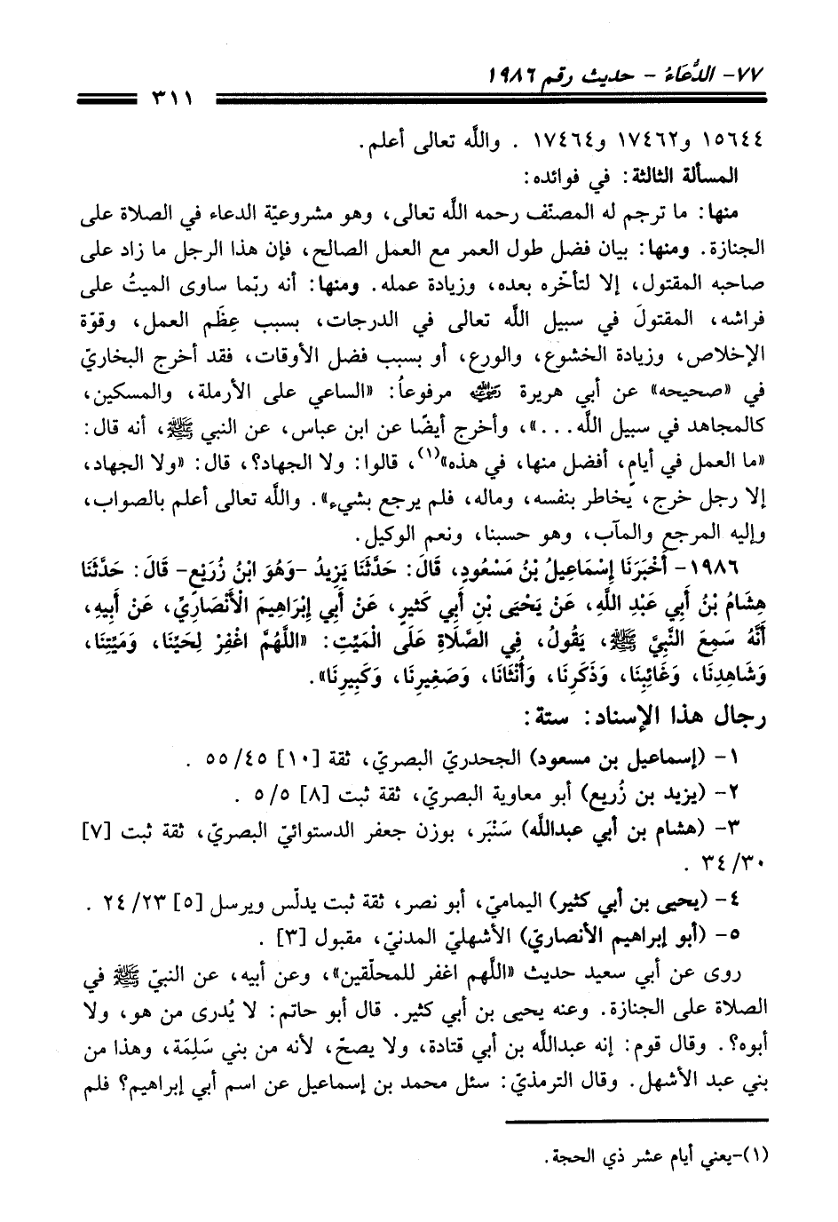 1986 - أَخْبَرَنَا إِسْمَاعِيلُ بْنُ مَسْعُودٍ, قَالَ: حَدَّثَنَا يَزِيدُ -وَهُوَ ابْنُ زُرَيْعٍ- قَالَ: حَدَّثَنَا هِشَامُ بْنُ أَبِي عَبْدِ اللَّهِ, عَنْ يَحْيَى بْنِ أَبِي كَثِيرٍ, عَنْ أَبِي إِبْرَاهِيمَ الأَنْصَارِيِّ, عَنْ أَبِيهِ, أَنَّهُ سَمِعَ النَّبِيَّ - صلى اللَّه عليه وسلم -, يَقُولُ, فِي الصَّلاَةِ عَلَى الْمَيِّتِ: «اللَّهُمَّ اغْفِرْ لِحَيِّنَا, وَمَيِّتِنَا, وَشَاهِدِنَا, وَغَائِبِنَا, وَذَكَرِنَا, وَأُنْثَانَا, وَصَغِيرِنَا, وَكَبِيرِنَا».