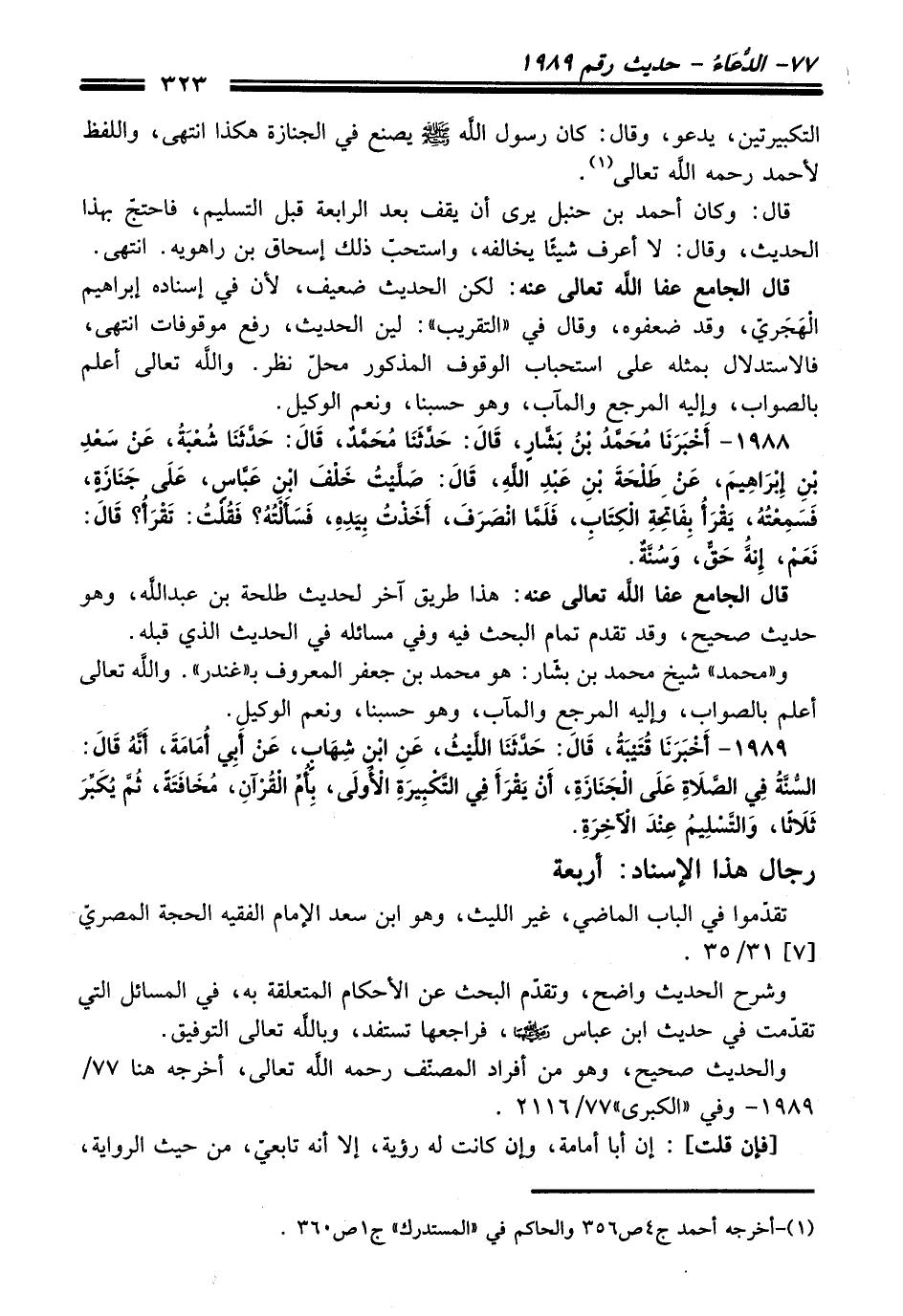 1988 - أَخْبَرَنَا مُحَمَّدُ بْنُ بَشَّارٍ, قَالَ: حَدَّثَنَا مُحَمَّدٌ, قَالَ: حَدَّثَنَا شُعْبَةُ,, عَنْ سَعْدِ بْنِ إِبْرَاهِيمَ, عَنْ طَلْحَةَ بْنِ عَبْدِ اللَّهِ, قَالَ: صَلَّيْتُ خَلْفَ ابْنِ عَبَّاسٍ, عَلَى جَنَازَةٍ, فَسَمِعْتُهُ, يَقْرَأُ بِفَاتِحَةِ الْكِتَابِ, فَلَمَّا انْصَرَفَ, أَخَذْتُ بِيَدِهِ, فَسَأَلْتُهُ؟ فَقُلْتُ: تَقْرَأُ؟ قَالَ: نَعَمْ, إِنَّهُ حَقٌّ, وَسُنَّةٌ.