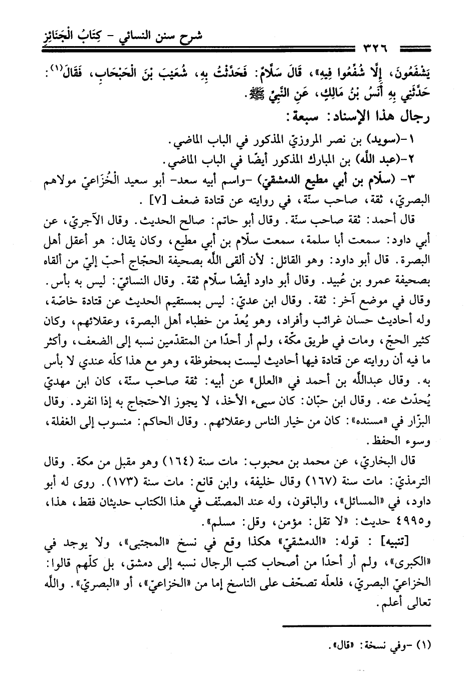 [تنبيه]: قوله: "الدمشقيّ" هكذا وقع في نسخ "المجتبى"، ولا يوجد في "الكبرى"، ولم أر أحدًا من أصحاب كتب الرجال نسبه إلى دمشق، بل كلّهم قالوا: الخزاعيّ البصريّ، فلعلّه تصحّف على الناسخ إما من "الخزاعيّ"، أو "البصريّ". واللَّه تعالى أعلم.