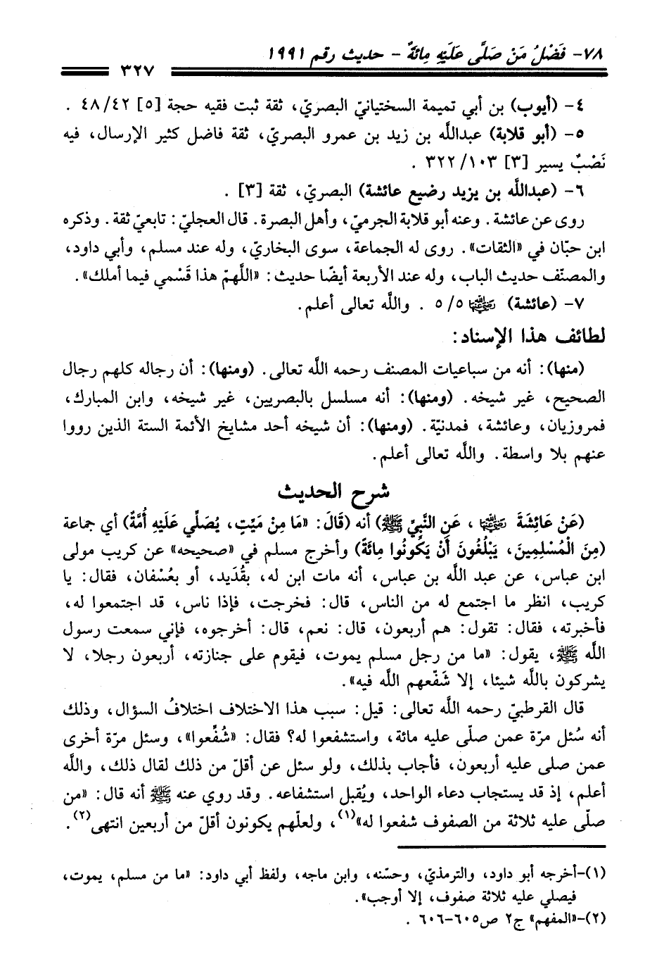(¬1) - أخرجه أبو داود، والترمذيّ، وحسّنه، وابن ماجه، ولفظ أبي داود: "ما من مسلم، يموت، فيصلي عليه ثلاثة صفوت، إلا أوجب".