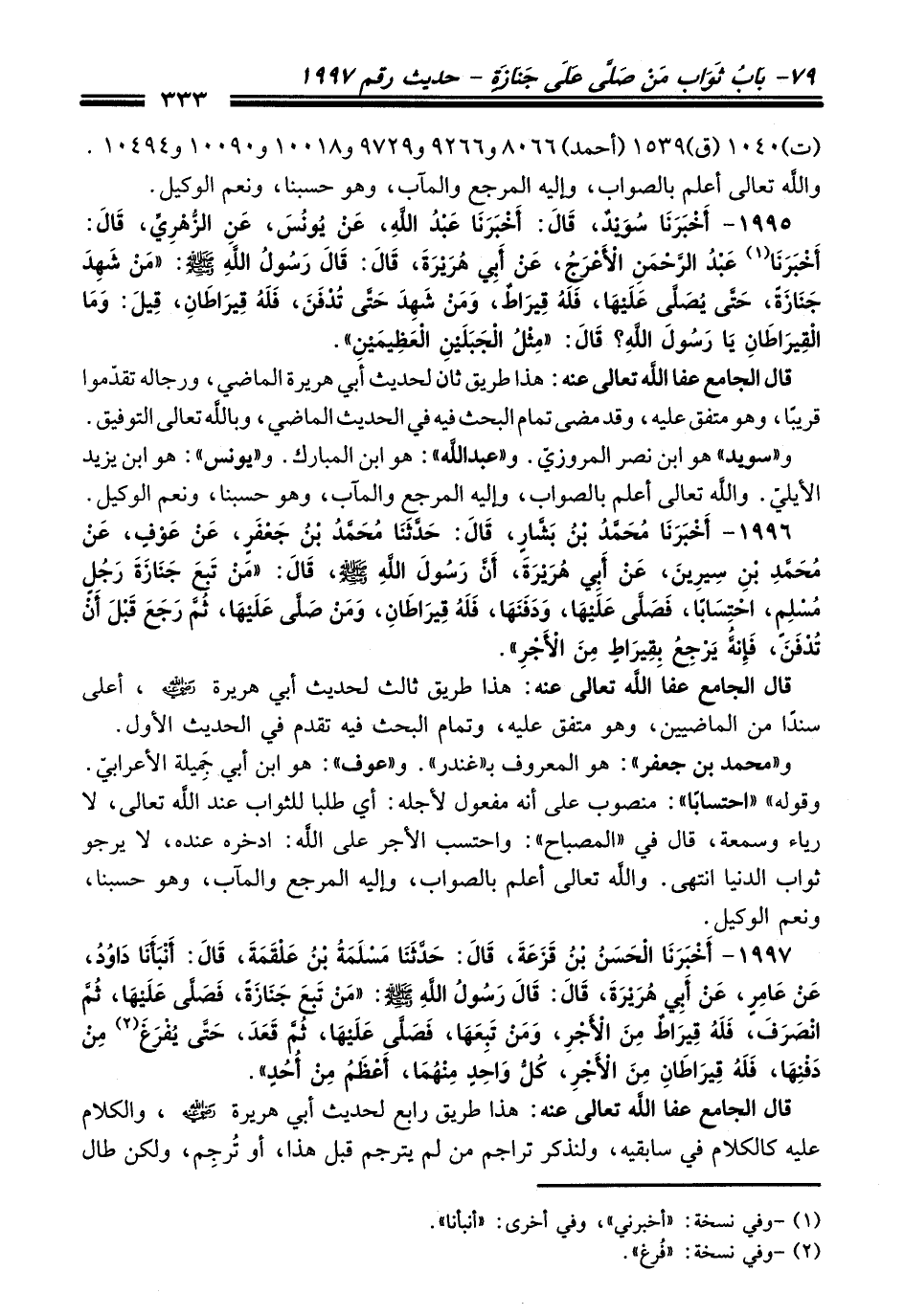 1996 - أَخْبَرَنَا مُحَمَّدُ بْنُ بَشَّارٍ,, قَالَ: حَدَّثَنَا مُحَمَّدُ بْنُ جَعْفَرٍ, عَنْ عَوْفٍ, عَنْ مُحَمَّدِ بْنِ سِيرِينَ, عَنْ أَبِي هُرَيْرَةَ,, أَنَّ رَسُولَ اللَّهِ - صلى اللَّه عليه وسلم -, قَالَ: «مَنْ تَبِعَ جَنَازَةَ رَجُلٍ مُسْلِمٍ, احْتِسَابًا, فَصَلَّى عَلَيْهَا, وَدَفَنَهَا فَلَهُ قِيرَاطَانِ, وَمَنْ صَلَّى عَلَيْهَا, ثُمَّ رَجَعَ قَبْلَ أَنْ تُدْفَنَ, فَإِنَّهُ يَرْجِعُ بِقِيرَاطٍ مِنَ الأَجْرِ».