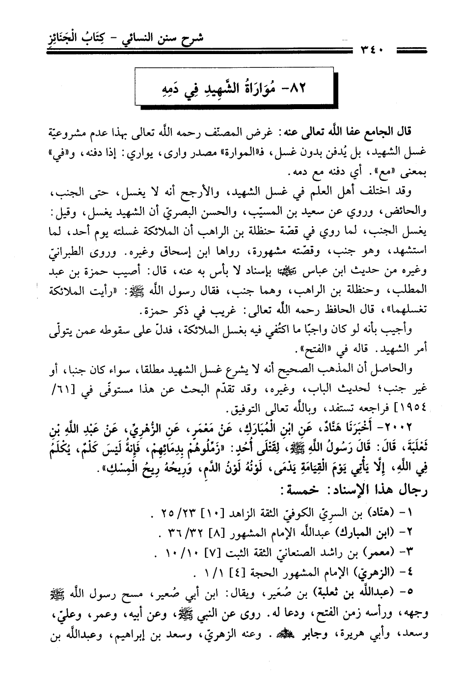 2002 - أَخْبَرَنَا هَنَّادٌ, عَنِ ابْنِ الْمُبَارَكِ, عَنْ مَعْمَرٍ, عَنِ الزُّهْرِيِّ, عَنْ عَبْدِ اللَّهِ بْنِ ثَعْلَبَةَ, قَالَ: قَالَ رَسُولُ اللَّهِ - صلى اللَّه عليه وسلم -, لِقَتْلَى أُحُدٍ: «زَمِّلُوهُمْ بِدِمَائِهِمْ, فَإِنَّهُ لَيْسَ كَلْمٌ, يُكْلَمُ فِي اللَّهِ, إِلاَّ يَأْتِى يَوْمَ الْقِيَامَةِ يَدْمَى, لَوْنُهُ لَوْنُ الدَّمِ, وَرِيحُهُ رِيحُ الْمِسْكِ».