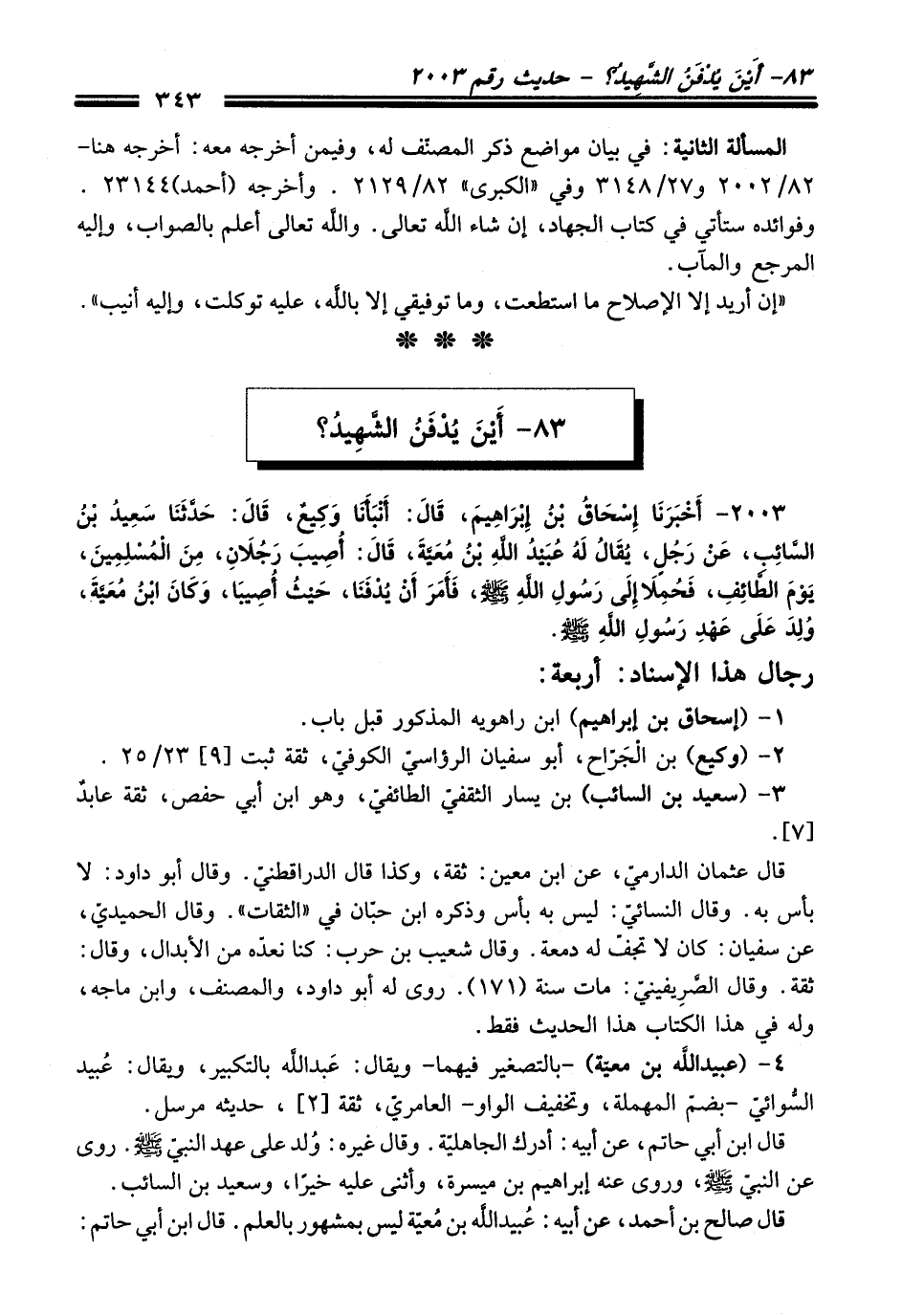 2003 - أَخْبَرَنَا إِسْحَاقُ بْنُ إِبْرَاهِيمَ, قَالَ: أَنْبَأَنَا وَكِيعٌ, قَالَ: حَدَّثَنَا سَعِيدُ بْنُ السَّائِبِ, عَنْ رَجُلٍ, يُقَالُ لَهُ عُبَيْدُ اللَّهِ بْنُ مُعَيَّةَ, قَالَ: أُصِيبَ رَجُلاَنِ, مِنَ الْمُسْلِمِينَ, يَوْمَ الطَّائِفِ, فَحُمِلاَ إِلَى رَسُولِ اللَّهِ - صلى اللَّه عليه وسلم -, فَأَمَرَ أَنْ يُدْفَنَا, حَيْثُ أُصِيبَا, وَكَانَ ابْنُ مُعَيَّةَ, وُلِدَ عَلَى عَهْدِ رَسُولِ اللَّهِ - صلى اللَّه عليه وسلم -.