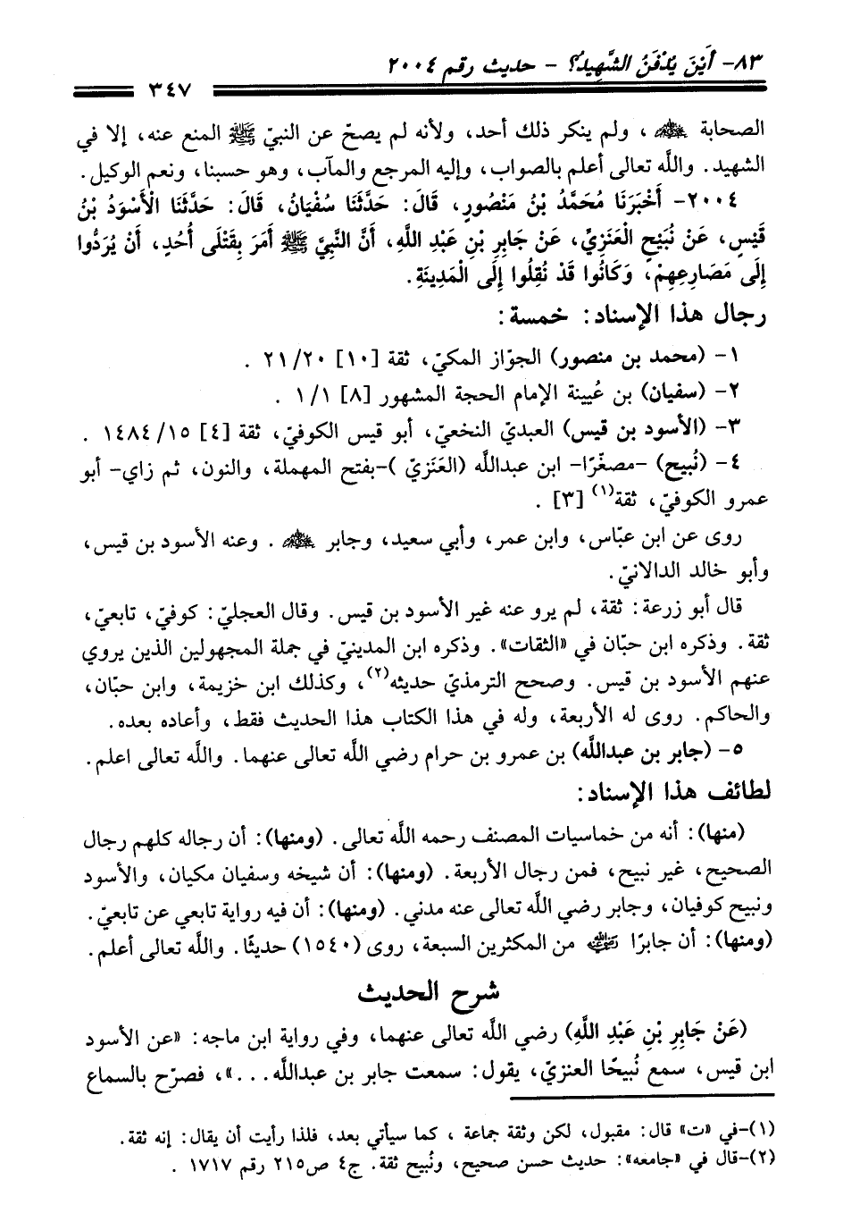 2004 - أَخْبَرَنَا مُحَمَّدُ بْنُ مَنْصُورٍ, قَالَ: حَدَّثَنَا سُفْيَانُ, قَالَ: حَدَّثَنَا الأَسْوَدُ بْنُ قَيْسٍ, عَنْ نُبَيْحٍ الْعَنَزِيِّ, عَنْ جَابِرِ بْنِ عَبْدِ اللَّهِ, أَنَّ النَّبِيَّ - صلى اللَّه عليه وسلم - أَمَرَ بِقَتْلَى أُحُدٍ, أَنْ يُرَدُّوا إِلَى مَصَارِعِهِمْ, وَكَانُوا قَدْ نُقِلُوا إِلَى الْمَدِينَةِ.