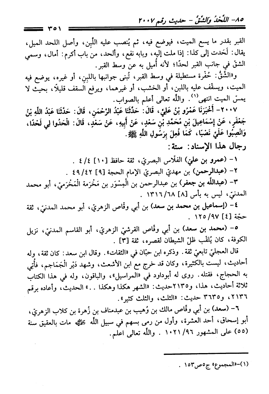 2007 - أَخْبَرَنَا عَمْرُو بْنُ عَلِيٍّ, قَالَ: حَدَّثَنَا عَبْدُ الرَّحْمَنِ, قَالَ: حَدَّثَنَا عَبْدُ اللَّهِ بْنُ جَعْفَرٍ, عَنْ إِسْمَاعِيلَ بْنِ مُحَمَّدِ بْنِ سَعْدٍ, عَنْ أَبِيهِ, عَنْ سَعْدٍ, قَالَ: الْحَدُوا لِي لَحْدًا, وَانْصِبُوا عَلَيَّ نَصْبًا, كَمَا فُعِلَ بِرَسُولِ اللَّهِ - صلى اللَّه عليه وسلم -.