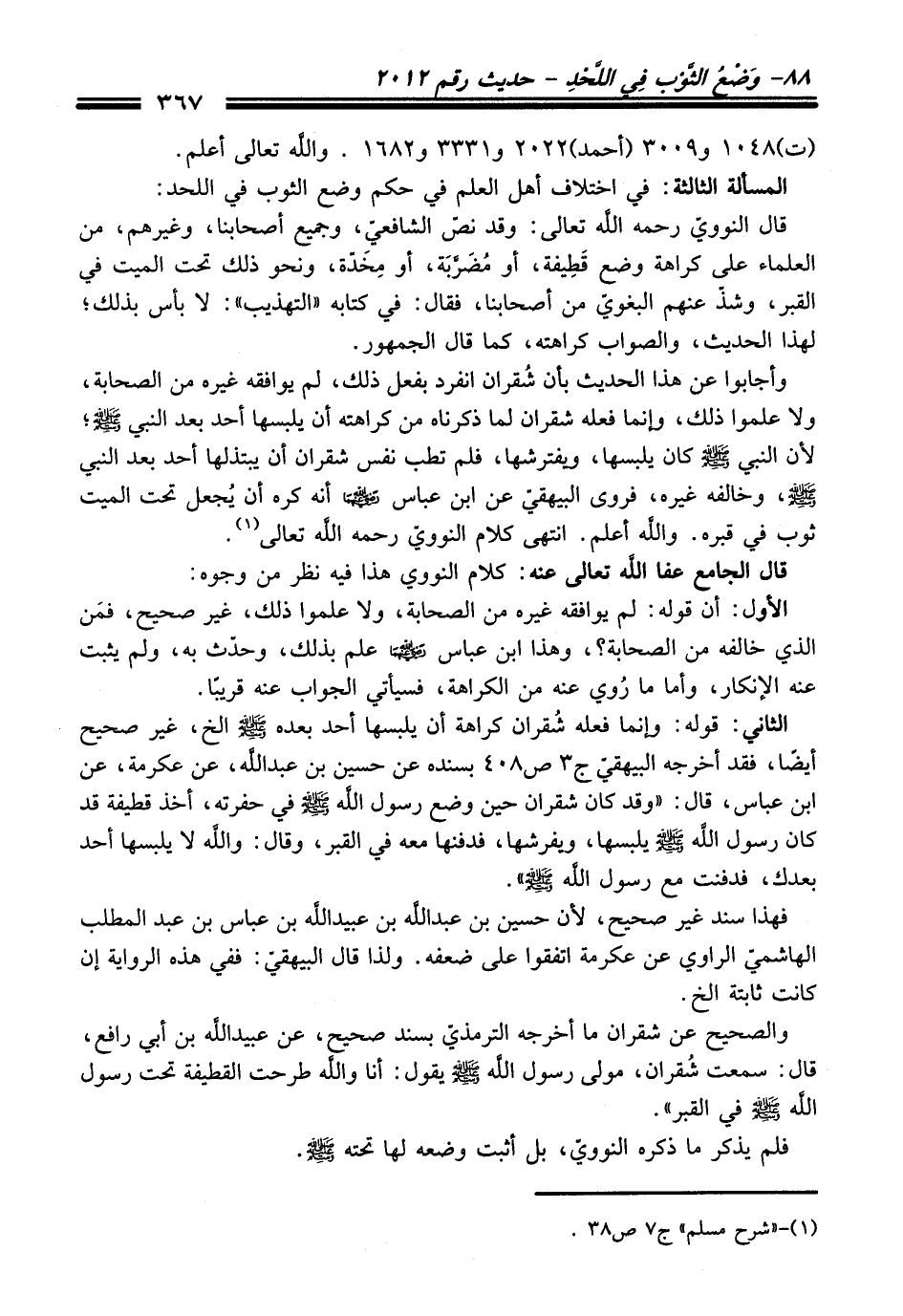 وأجابوا عن هذا الحديث بأن شُقران انفرد بفعل ذلك، لم يوافقه غيره من الصحابة، ولا علموا ذلك، وإنما فعله شقران لما ذكرناه من كراهته أن يلبسها أحد بعد النبي - صلى اللَّه عليه وسلم -؛ لأن النبي - صلى اللَّه عليه وسلم - كان يلبسها، ويفترشها، فلم تطب نفس شقران أن يبتذلها أحد بعد النبي لمجر، وخالفه غيره، فروى البيهقيّ عن ابن عباس - رضي اللَّه عنهما - أنه كره أن يُجعل تحت الميت ثوب في قبره. واللَّه أعلم. انتهى كلام النوويّ -رَحِمَهُ اللَّهُ تَعَالَى- (¬1).
