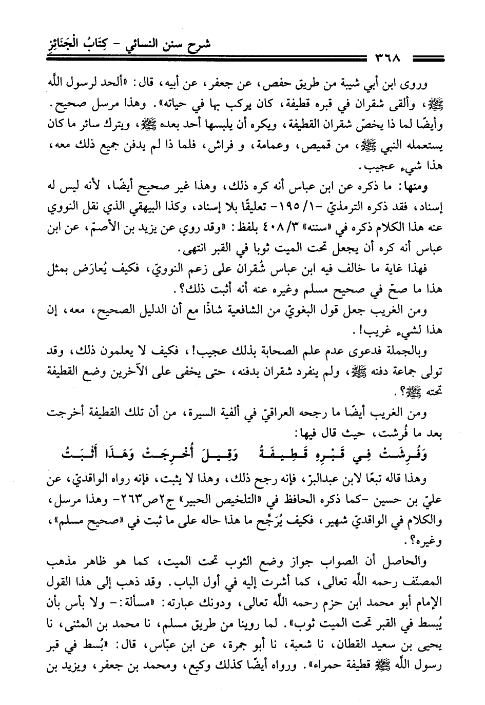 وروى ابن أبي شيبة من طريق حفص، عن جعفر، عن أبيه، قال: "ألحد لرسول اللَّه - صلى اللَّه عليه وسلم -، وألقى شقران في قبره قطيفة، كان يركب بها في حياته". وهذا مرسل صحيح. وأيضًا لماذا يخصّ شقران القطيفة، ويكره أن يلبسها أحد بعده - صلى اللَّه عليه وسلم -، ويترك سائر ما كان يستعمله النبي - صلى اللَّه عليه وسلم -، من قميص، وعمامة، وفراش، فلماذا لم يدفن جميع ذلك معه، هذا شيء عجيب.