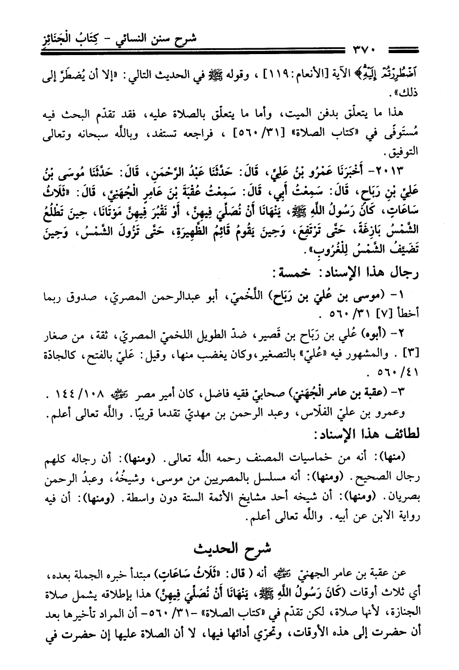 2013 - أَخْبَرَنَا عَمْرُو بْنُ عَلِيٍّ, قَالَ: حَدَّثَنَا عَبْدُ الرَّحْمَنِ, قَالَ: حَدَّثَنَا مُوسَى بْنُ عَلَيِّ بْنِ رَبَاحٍ, قَالَ: سَمِعْتُ أَبِي, قَالَ: سَمِعْتُ عُقْبَةَ, بْنَ عَامِرٍ الْجُهَنِيَّ, قَالَ: "ثَلاَثُ سَاعَاتٍ, كَانَ رَسُولُ اللَّهِ - صلى اللَّه عليه وسلم -, يَنْهَانَا أَنْ نُصَلِّيَ فِيهِنَّ, أَوْ نَقْبُرَ فِيهِنَّ مَوْتَانَا, حِينَ تَطْلُعُ الشَّمْسُ بَازِغَةً, حَتَّى تَرْتَفِعَ, وَحِينَ يَقُومُ قَائِمُ الظَّهِيرَةِ, حَتَّى تَزُولَ الشَّمْسُ, وَحِينَ تَضَيَّفُ الشَّمْسُ لِلْغُرُوبِ".