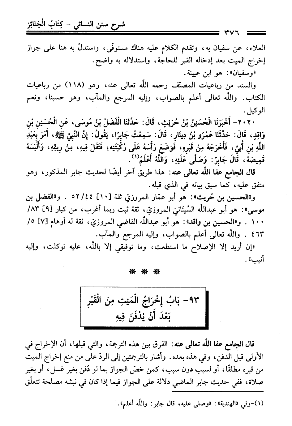 2020 - أَخْبَرَنَا الْحُسَيْنُ بْنُ حُرَيْثٍ, قَالَ: حَدَّثَنَا الْفَضْلُ بْنُ مُوسَى, عَنِ الْحُسَيْنِ بْنِ وَاقِدٍ, قَالَ: حَدَّثَنَا عَمْرُو بْنُ دِينَارٍ, قَالَ: سَمِعْتُ جَابِرًا, يَقُولُ: إِنَّ النَّبِيَّ - صلى اللَّه عليه وسلم -, أَمَرَ بِعَبْدِ اللَّهِ بْنِ أُبَيٍّ, فَأَخْرَجَهُ مِنْ قَبْرِهِ, فَوَضَعَ رَأْسَهُ عَلَى رُكْبَتَيْهِ, فَتَفَلَ فِيهِ, مِنْ رِيقِهِ, وَأَلْبَسَهُ قَمِيصَهُ, قَالَ: جَابِرٌ: وَصَلَّى عَلَيْهِ, وَاللَّهُ أَعْلَمُ (¬1).