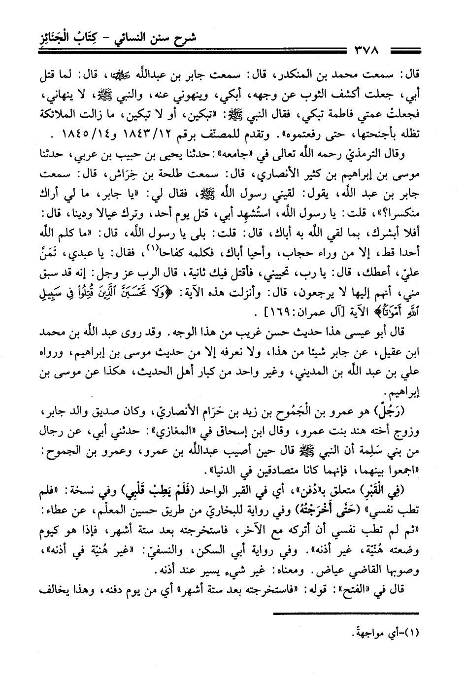 وقال الترمذيّ -رَحِمَهُ اللَّهُ تَعَالَى- في "جامعه": حدثنا يحيى بن حبيب بن عربي، حدثنا موسى بن إبراهيم بن كثير الأنصاري، قال: سمعت طلحة بن خِرَاش، قال: سمعت جابر بن عبد اللَّه، يقول: لقيني رسول اللَّه - صلى اللَّه عليه وسلم -، فقال لي: "يا جابر، ما لي أراك منكسرا؟ "، قدت: يا رسول اللَّه، استُشهِد أبي، قتل يوم أحد، وترك عيالا ودينا، قال: أفلا أبشرك، بما لقي اللَّه به أباك، قال: قلت: بلى يا رسول اللَّه، قال: "ما كلم اللَّه أحدا قط، إلا من وراء حجاب، وأحيا أباك، فكلمه كفاحا (¬1)، فقال: يا عبدي، تَمَنَّ عليّ، أعطك، قال: يا رب، تحييني، فأقتل فيك ثانية، قال الرب -عَزَّ وَجَلَّ-: إنه قد سبق مني، أنهم إليها لا يرجعون، قال: وأنزلت هذه الآية: {ولَا تَحْسَبَنَّ الَّذِينَ قُتِلُوا فِي سَبِيلِ اللَّهِ أَمْوَاتًا} الآية [آل عمران: 169].