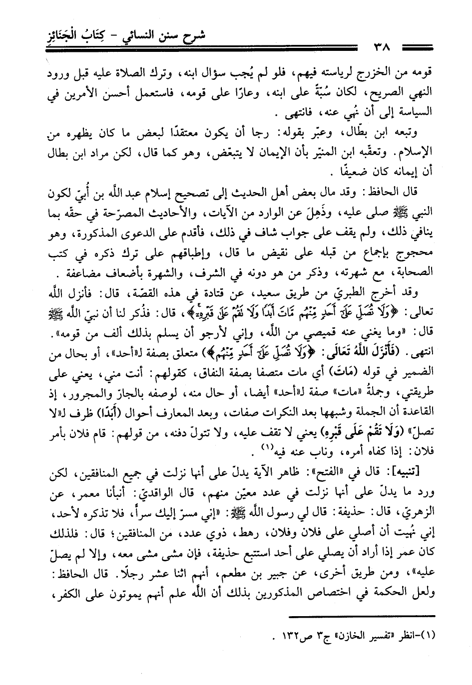 قال الحافظ: وقد مال بعض أهل الحديث إلى تصحيح إسلام عبد اللَّه بن أُبيّ لكون النبي - صلى اللَّه عليه وسلم - صلى عليه، وذَهِلَ عن الوارد من الآيات، والأحاديث المصرّحة في حقّه بما ينافي ذلك، ولم يقف على جواب شاف في ذلك، فأقدم على الدعوى المذكورة، وهو محجوج بإجماع من قبله على نقيض ما قال، وإطباقهم على ترك ذكره في كتب الصحابة، مع شهرته، وذكر من هو دونه في الشرف، والشهرة بأضعاف مضاعفة.