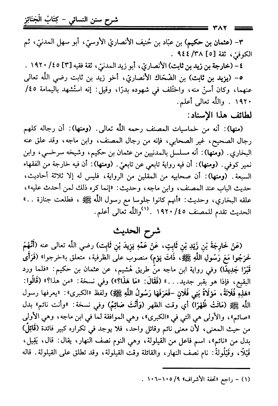 (عَنْ خَارِجَةَ بْنِ زَيْدِ بْنِ ثَابِتٍ، عَنْ عَمِّهِ يَزِيدَ بْنِ ثَابِت) - رضي اللَّه تعالى عنه - (أَنَّهُمْ خَرَجُوا مَعَ رَسُولِ اللَّهِ - صلى اللَّه عليه وسلم -، ذَاتَ يَوْمٍ) منصوب على الظرفية، متعلق بـ "خرجوا" (فَرَأَى قَبْرًا جَدِيدًا) وفي رواية ابن ماجه من طريق هُشيم، عن عثمان بن حكيم: "فلما ورد البقيع، فإذا هو بقبر جديد ... " (فَقَالَ: "مَا هَذَا؟ ") وفي نسخة: "من هذا؟ " (قَالُوا: "هَذِهِ فُلَانَةُ، مَوْلَاةُ بَنِي فُلَانٍ -فَعَرَفَهَا رَسُولُ اللَّهِ - صلى اللَّه عليه وسلم -) ولفظ "الكبرى": "يعرفها رسول اللَّه - صلى اللَّه عليه وسلم - (مَاتَتْ ظُهْرًا) أي وقت الظهر (وَأَنْتَ صَائِمٌ) وفي نسخة: "وأنت نائم" بدل "صائم"، والأولى هي التي في "الكبرى"، وهي الموافقة لما في ابن ماجه، وهي الأولى من حيث المعنى، لأن معنى نائم وقائل واحد، فلا يوجد في تكراره كبير فائدة (قَائِلٌ) بدل من "نائم"، اسم فاعل من القيلولة، وهي النوم نصف النهار، يقال: قال، يَقِيل، قَيْلاً، وقَيْلُولةَ: نام نصف النهار، والقائلة وقت القيلولة، وقد تطلق على القيلولة. قاله