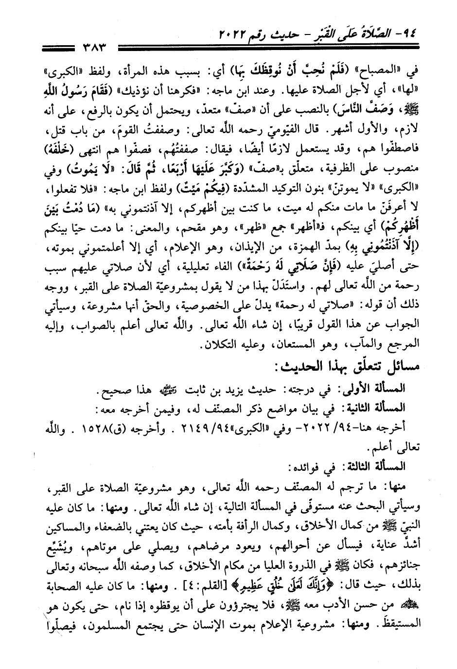 في "المصباح" (فَلَمْ نُحِبَّ أَن نُوقِظَكَ بِهَا) أي: بسبب هذه المرأة، ولفظ "الكبرى" "لها"، أي لأجل الصلاة عليها. وعند ابن ماجه: "فكرهنا أن نؤذيك" (فَقَامَ رَسُولُ اللَّهِ - صلى اللَّه عليه وسلم -، وَصَفَّ النَّاسَ) بالنصب على أن "صفّ" متعدّ، ويحتمل أن يكون بالرفع، على أنه لازم، والأول أشهر. قال الفيّوميّ -رَحِمَهُ اللَّهُ تَعَالَى-: وصففتُ القومَ، من باب قتل، فاصطفّوا هم، وقد يستعمل لازمًا أيضًا، فيقال: صففتُهُم، فصفّوا هم انتهى (خَلْفَهُ) منصوب على الظرفية، متعلّق بـ"صفّ" (وَكَبَّرَ عَلَيْهَا أَرْبَعًا، ثُمَّ قَالَ: "لَا يَمُوتُ) وفي "الكبرى" "لا يموتنّ" بنون التوكيد المشدّدة (فِيكُمْ مَيِّتٌ) ولفظ ابن ماجه: "فلا تفعلوا، لا أعرفَنّ ما مات منكم له ميت، ما كنت بين أَظْهُركُمْ، إلا آذنتموني به" (مَا دُمْتُ بَيْنَ أَظْهُرِكُمْ) أي بينكم، فـ"أظهر" جمع "ظهر"، وهو مقحم، والمعنى: ما دمت حيّا بينكم (إِلَّا آذَنْتُمُوني بهِ) بمدّ الهمزة، من الإيذان، وهو الإعلام، أي إلا أعلمتموني بموته، حتى أصليَ علَيه (فَإِنَّ صَلَاتِي لَهُ رَحْمَةٌ") الفاء تعليلية، أي لأن صلاتي عليهم سبب رحمة من اللَّه تعالى لهم. واستَدَلّ بهذا من لا يقول بمشروعيّة الصلاة على القبر، ووجه ذلك أن قوله:، "صلاتي له رحمة" يدلّ على الخصوصية، والحقّ أنها مشروعة، وسيأتي الجواب عن هذا القول قريبًا، إن شاء اللَّه تعالى. واللَّه تعالى أعلم بالصواب، وإليه المرجع والمآب، وهو المستعان، وعليه التكلان.