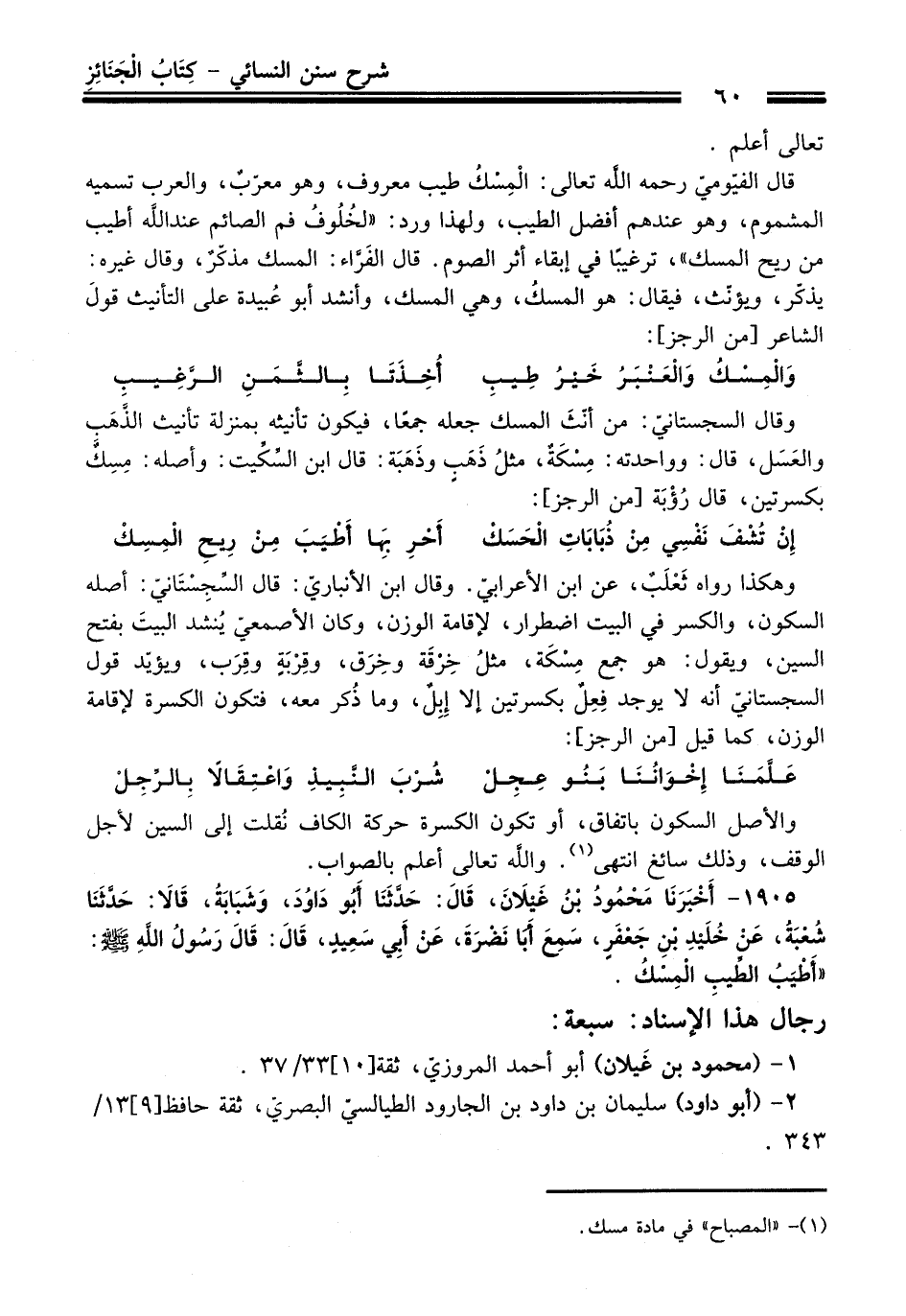 1905 - أَخْبَرَنَا مَحْمُودُ بْنُ غَيْلاَنَ, قَالَ: حَدَّثَنَا أَبُو دَاوُدَ, وَشَبَابَةُ, قَالاَ: حَدَّثَنَا شُعْبَةُ, عَنْ خُلَيْدِ بْنِ جَعْفَرٍ, سَمِعَ أَبَا نَضْرَةَ, عَنْ أَبِي سَعِيدٍ, قَالَ: قَالَ رَسُولُ اللَّهِ - صلى اللَّه عليه وسلم -: «أَطْيَبُ الطِّيبِ الْمِسْكُ».