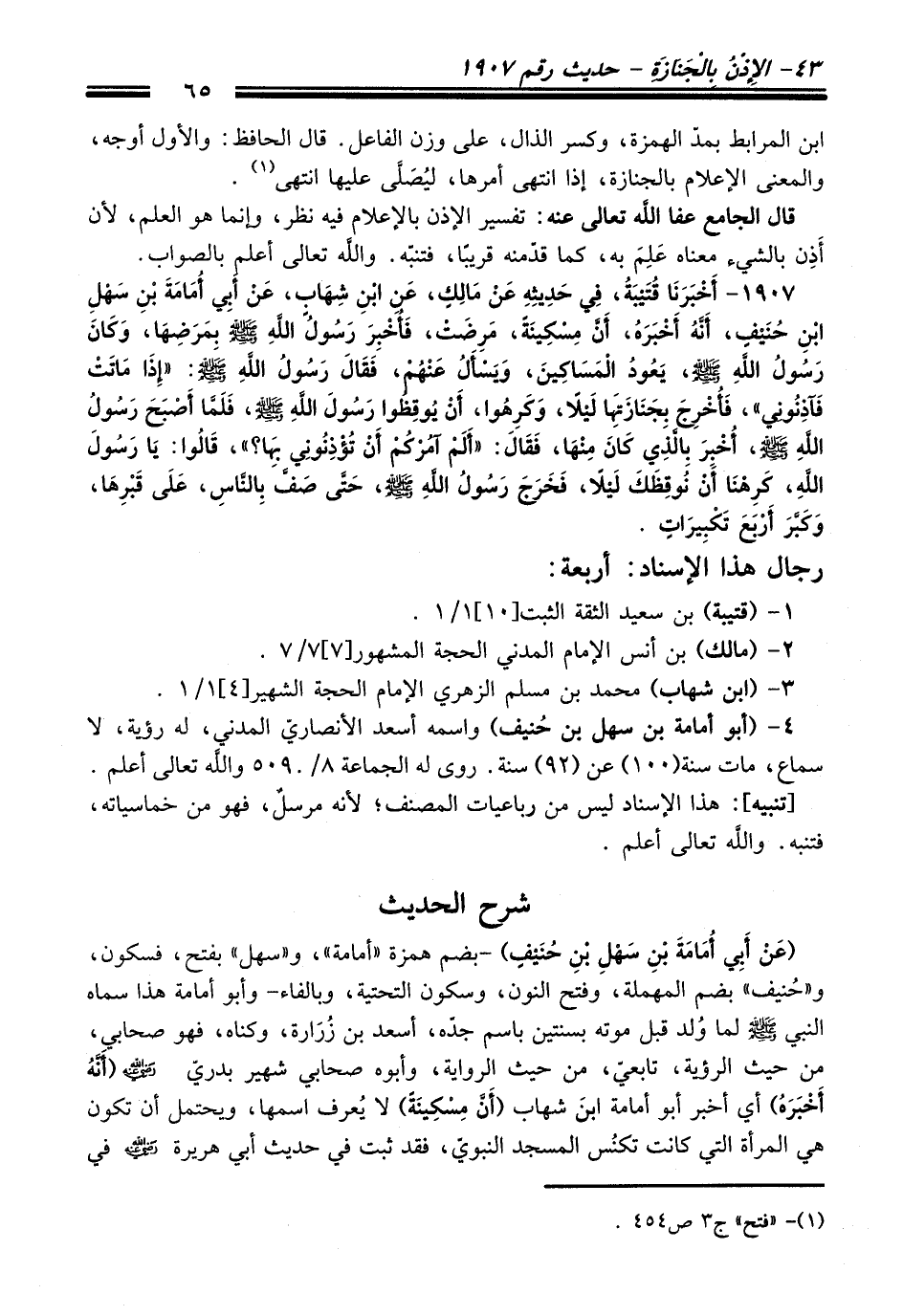 1907 - أَخْبَرَنَا قُتَيْبَةُ, فِي حَدِيثِهِ عَنْ مَالِكٍ, عَنِ ابْنِ شِهَابٍ, عَنْ أَبِي أُمَامَةَ بْنِ سَهْلِ بْنِ حُنَيْفٍ, أَنَّهُ أَخْبَرَهُ, أَنَّ مِسْكِينَةً, مَرِضَتْ, فَأُخْبِرَ رَسُولُ اللَّهِ - صلى اللَّه عليه وسلم - بِمَرَضِهَا, وَكَانَ رَسُولُ اللَّهِ - صلى اللَّه عليه وسلم -, يَعُودُ الْمَسَاكِينَ, وَيَسْأَلُ عَنْهُمْ, فَقَالَ رَسُولُ اللَّهِ - صلى اللَّه عليه وسلم -: «إِذَا مَاتَتْ فَآذِنُونِي» ,