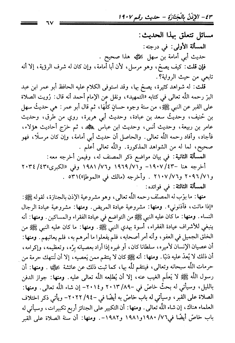 قلت: له شواهد كثيرة، يصحّ بها، وقد استوفى الكلام عليه الحافظ أبو عمر ابن عبد البرّ -رَحِمَهُ اللَّهُ تَعَالَى- في كتابه "التمهيد"، ونقل عن الإمام أحمد أنه قال: رُويت الصلاة على القبر عن النبي - صلى اللَّه عليه وسلم -، من ستة وجوه حسانٍ كلُّهَا، ثم قال أبو عمر: هي حديثُ سهل بن حُنيف، وحديثُ سعد بن عبادة، وحديث أبي هريرة، روي من طرق، وحديث عامر بن ربيعة، وحديث أنس، وحديث ابن عباس - رضي اللَّه عنهم -، ثم خرّج أحاديث هؤلاء، فأجاد، وأفاد -رَحِمَهُ اللَّهُ تَعَالَى-. والحاصل أن حديث أبي أمامة، وإن كان مرسلًا، فهو صحيح، لما له من الشواهد المذكورة. واللَّه تعالى أعلم.