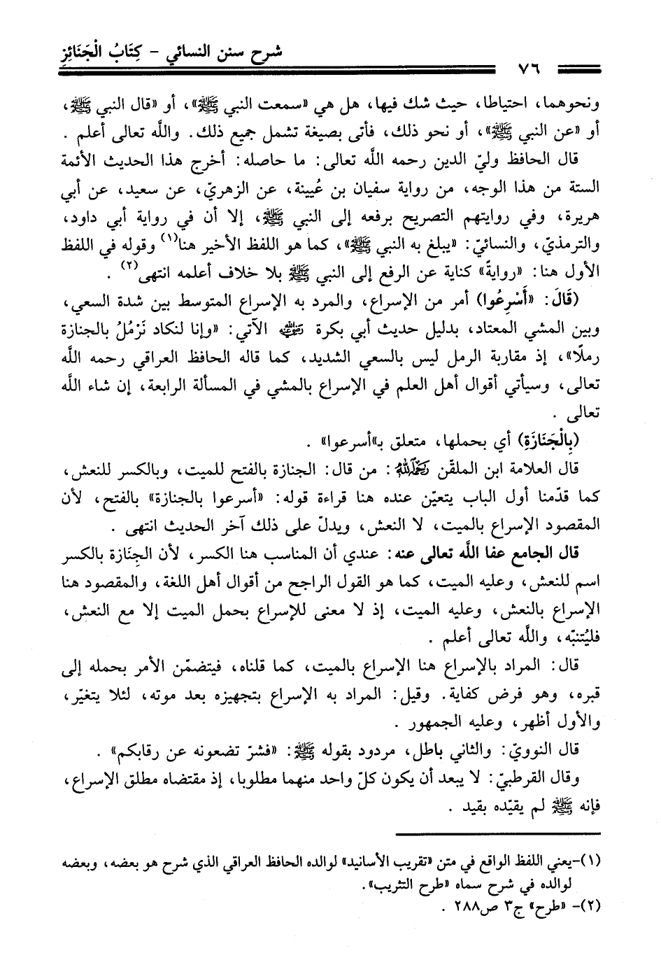 قال الجامع - عفا اللَّه تعالى عنه -: عندي أن المناسب هنا الكسر، لأن الجِنَازة بالكسر اسم للنعش، وعليه الميت، كما هو القول الراجح من أقوال أهل اللغة، والمقصود هنا الإسراع بالنعش، وعليه الميت، إذ لا معنى للإسراع بحمل الميت إلا مع النعش، فليُتنبّه، واللَّه تعالى أعلم.