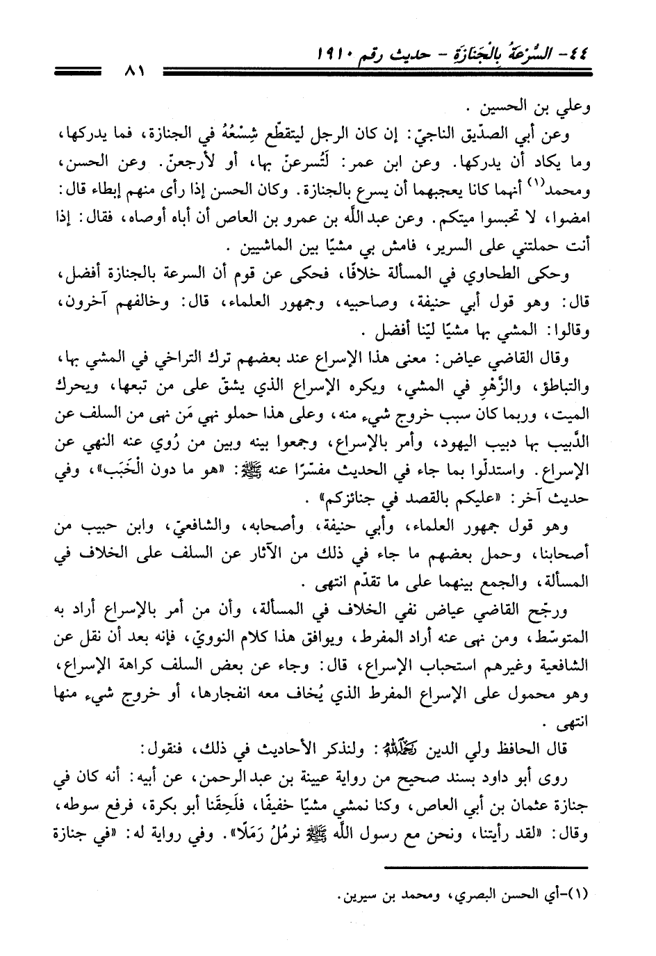 وعن أبي الصدّيق الناجيّ: إن كان الرجل ليتقطّع شِسْعُهُ في الجنازة، فما يدركها، وما يكاد أن يدركها. وعن ابن عمر: لَتُسرعنّ بها، أو لأرجعنّ. وعن الحسن، ومحمد (¬1) أنهما كانا يعجبهما أن يسرع بالجنازة. وكان الحسن إذا رأى منهم إبطاء قال: امضوا، لا تحبسوا ميتكم. وعن عبد اللَّه بن عمرو بن العاص أن أباه أوصاه، فقال: إذا أنت حملتني على السرير، فامش بي مشيًا بين الماشيين.