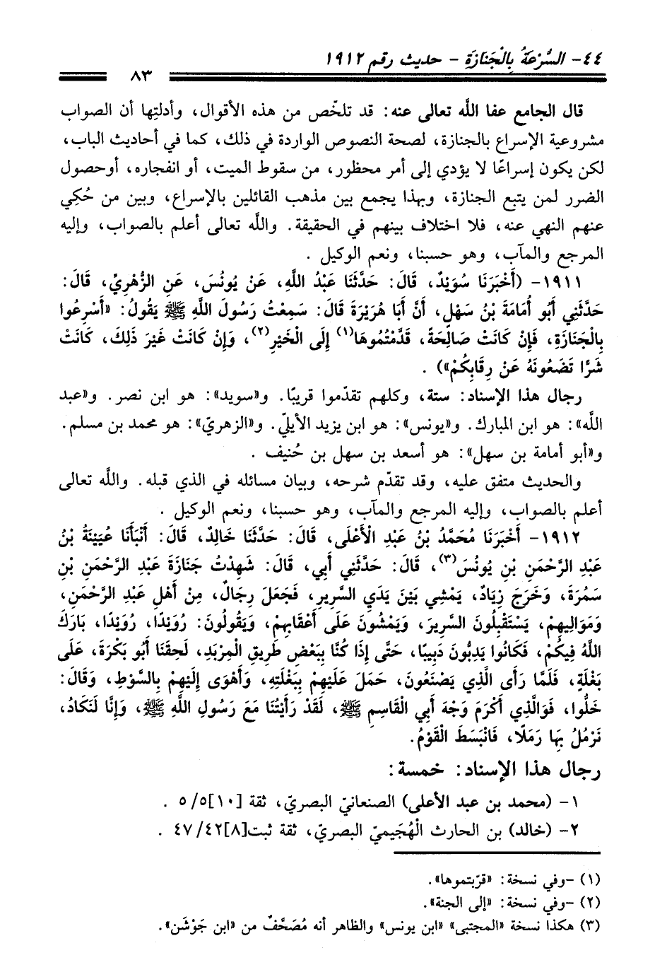 قال الجامع - عفا اللَّه تعالى عنه -: قد تلخّص من هذه الأقوال، وأدلتِها أن الصواب مشروعية الإسراع بالجنازة، لصحة النصوص الواردة في ذلك، كما في أحاديث الباب، لكن يكون إسراعًا لا يؤدي إلى أمر محظور، من سقوط الميت، أو انفجاره، أو حصول الضرر لمن يتبع الجنازة، وبهذا يجمع بين مذهب القائلين بالإسراع، وبين من حُكِي عنهم النهي عنه، فلا اختلاف بينهم في الحقيقة. واللَّه تعالى أعلم بالصواب، وإليه المرجع والمآب، وهو حسبنا، ونعم الوكيل.