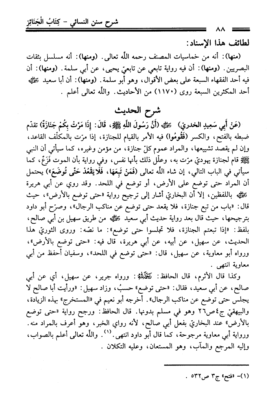 وكذا قال الأثرم، قال الحافظ: -رَحِمَهُ اللَّهُ-: ورواه جرير، عن سهيل، أي عن أبي صالح، عن أبي سعيد، فقال: "حتى توضع" حسبُ، وزاد سهيل: "ورأيت أبا صالح لا يجلس حتى توضع عن مناكب الرجال". أخرجه أبو نعيم في "المستخرج" بهذه الزيادة، والبيهقيّ ج 4 ص 26 وهو في مسلم بدونها. قال الحافظ: ورجح رواية "حتى توضع بالأرض" عند البخاريّ بفعل أبي صالح، لأنه رواي الخبر، وهو أعرف بالمراد منه.