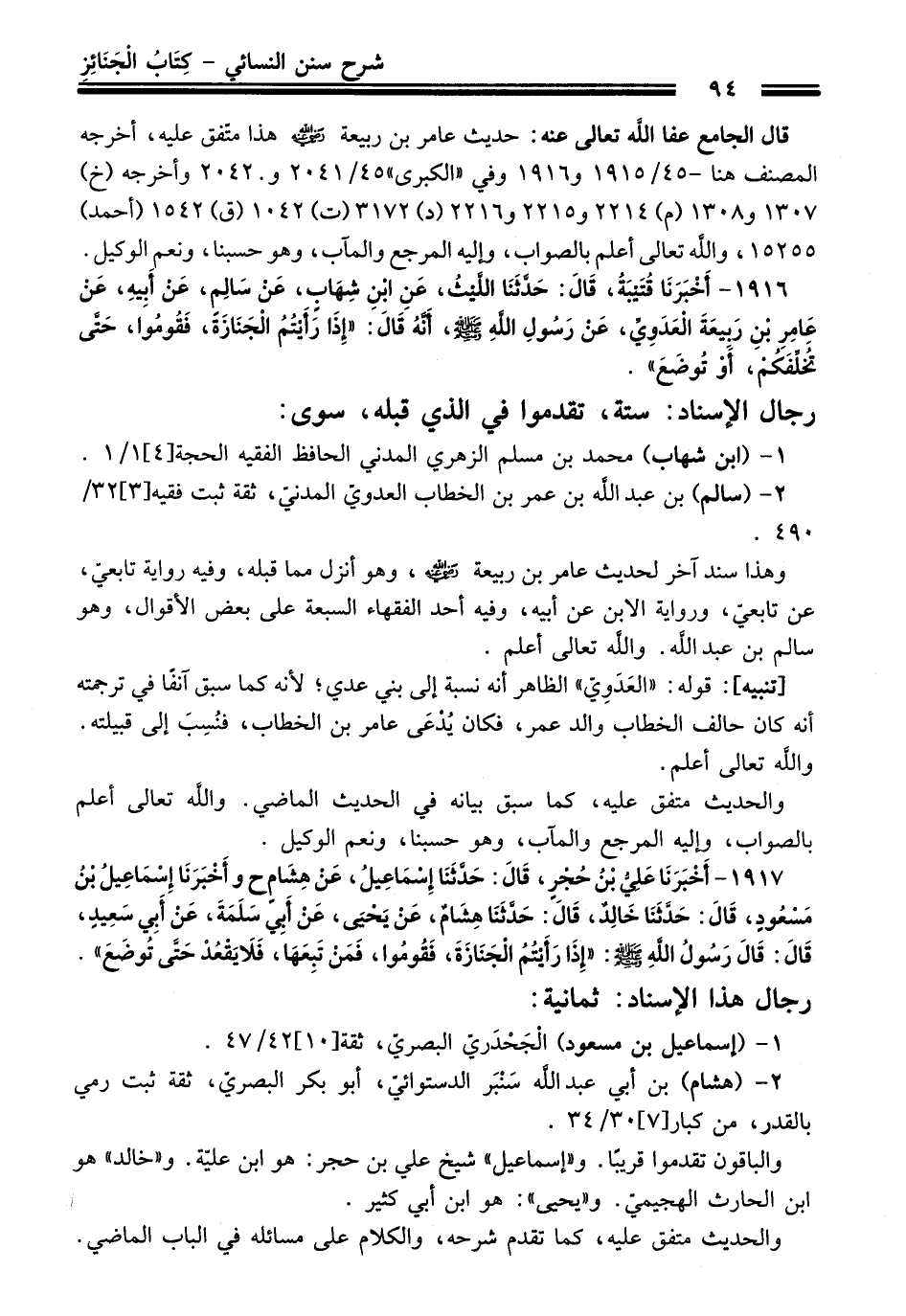1916 - أَخْبَرَنَا قُتَيْبَةُ,, قَالَ: حَدَّثَنَا اللَّيْثُ, عَنِ ابْنِ شِهَابٍ, عَنْ سَالِمٍ, عَنْ أَبِيهِ,, عَنْ عَامِرِ بْنِ رَبِيعَةَ الْعَدَوِيِّ, عَنْ رَسُولِ اللَّهِ - صلى اللَّه عليه وسلم -, أَنَّهُ قَالَ: «إِذَا رَأَيْتُمُ الْجَنَازَةَ, فَقُومُوا, حَتَّى تُخَلِّفَكُمْ, أَوْ تُوضَعَ».