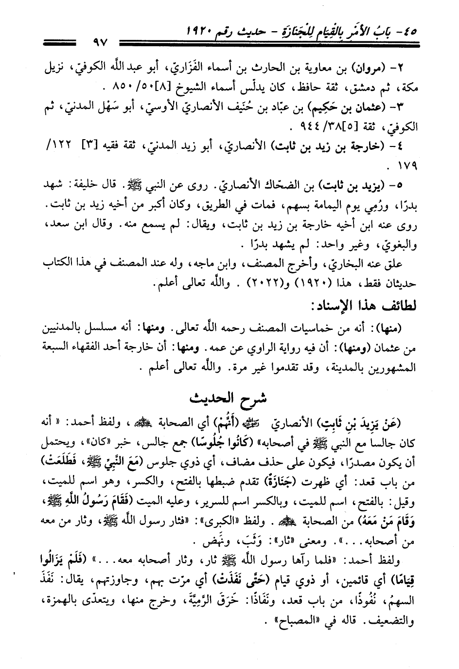 (عَنْ يَزِيدَ بنِ ثَابِتٍ) الأنصاريّ (أَنَّهُمْ) أي الصحابة - رضي اللَّه عنهم -، ولفظ أحمد: "أنه كان جالسا مع النبي - صلى اللَّه عليه وسلم - في أصحابه" (كَانُوا جُلُوسًا) جمع جالس، خبر "كان"، ويحتمل أن يكون مصدرًا، فيكون على حذف مضاف، أي ذوي جلوس (مَعَ النَّبِيِّ - صلى اللَّه عليه وسلم -، فَطَلَعَتْ) من باب قعد: أي ظهرت (جَنَازَةٌ) تقدم ضبطها بالفتح، والكسر، وهو اسم للميت، وقيل: بالفتح، اسم للميت، وبالكسر اسم للسرير، وعليه الميت (فَقَامَ رَسُولُ اللَّهِ - صلى اللَّه عليه وسلم -، وَقَامَ مَنْ مَعَهُ) من الصحابة - رضي اللَّه عنهم -. ولفظ "الكبِرى": "فثار رسول اللَّه - صلى اللَّه عليه وسلم -، وثار من معه من أصحابه ... ". ومعنى "ثار": وَثَبَ، ونَهَض.