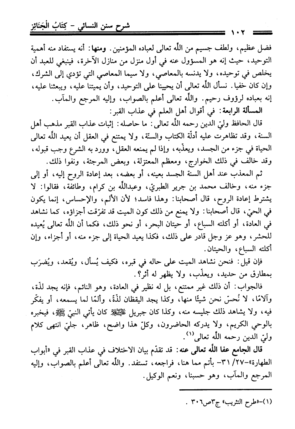 قال الحافظ وليّ الدين -رَحِمَهُ اللَّهُ تَعَالَى-: ما حاصله: إثبات عذاب القبر مذهب أهل السنة، وقد تظاهرت عليه أدلّة الكتاب والسنّة، ولا يمتنع في العقل أن يعيد اللَّه تعالى الحياة في جزء من الجسد، ويعذّبه، وإذا لم يمنعه العقل، وورد به الشرع وجب قبوله، وقد خالف في ذلك الخوارج، ومعظم المعتزلة، وبعض المرجئة، ونفوا ذلك.