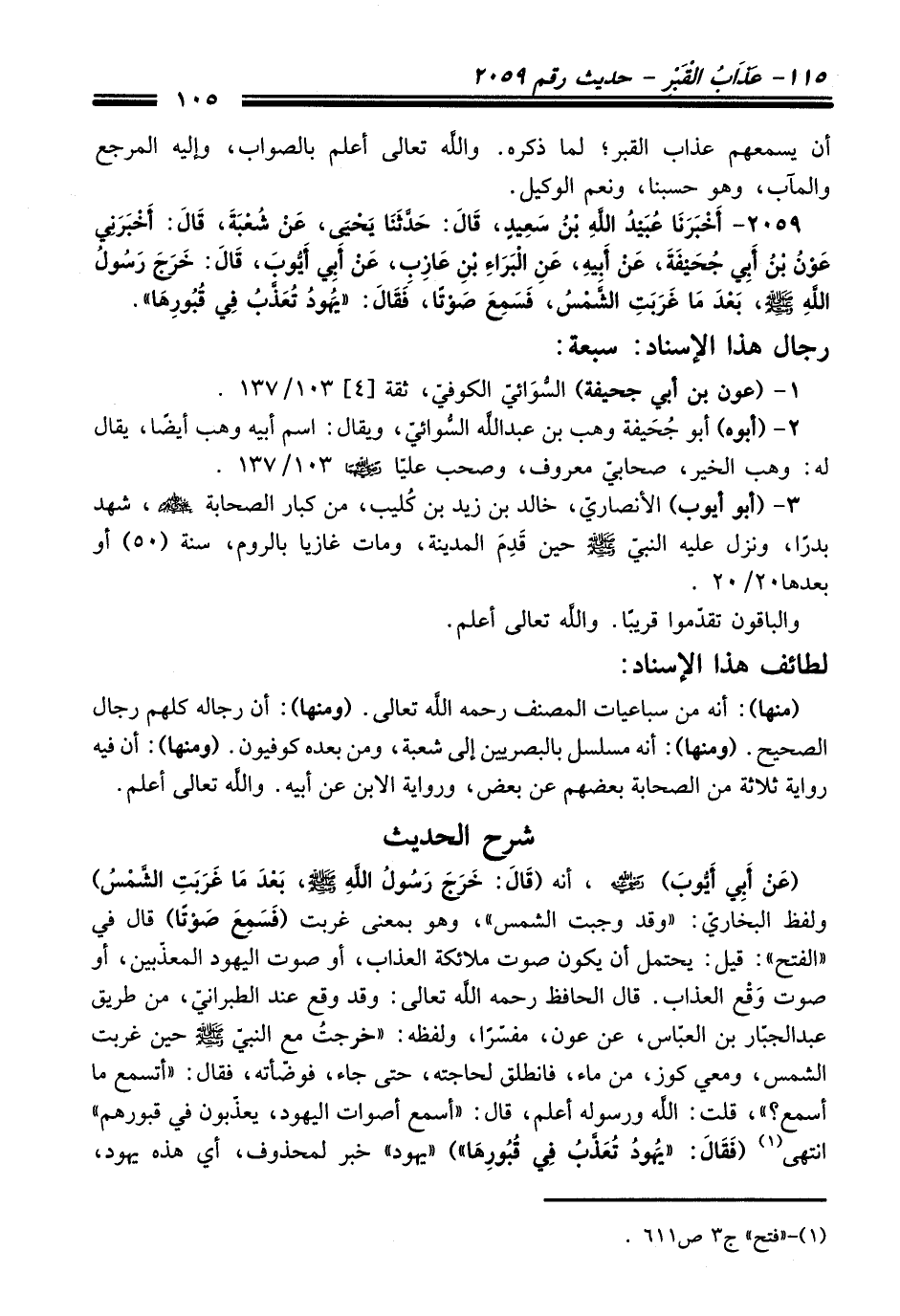 2059 - أَخْبَرَنَا عُبَيْدُ اللَّهِ بْنُ سَعِيدٍ, قَالَ: حَدَّثَنَا يَحْيَى, عَنْ شُعْبَةَ, قَالَ: أَخْبَرَنِي عَوْنُ بْنُ أَبِي جُحَيْفَةَ, عَنْ أَبِيهِ, عَنِ الْبَرَاءِ بْنِ عَازِبٍ, عَنْ أَبِي أَيُّوبَ, قَالَ: خَرَجَ رَسُولُ اللَّهِ - صلى اللَّه عليه وسلم -, بَعْدَ مَا غَرَبَتِ الشَّمْسُ, فَسَمِعَ صَوْتًا, فَقَالَ: «يَهُودُ تُعَذَّبُ فِي قُبُورِهَا».