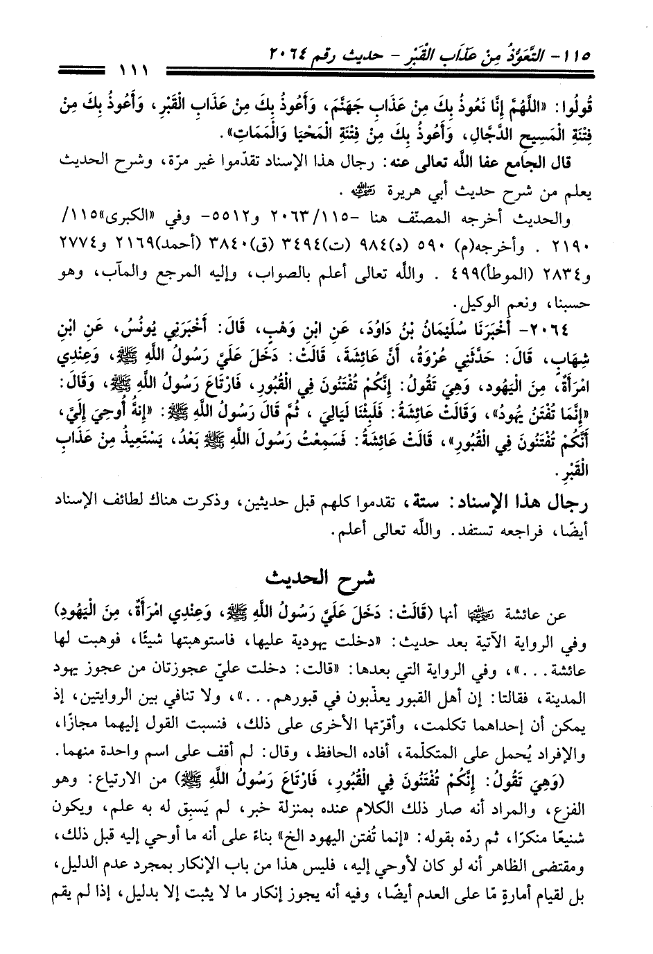 2064 - أَخْبَرَنَا سُلَيْمَانُ بْنُ دَاوُدَ, عَنِ ابْنِ وَهْبٍ, قَالَ: أَخْبَرَنِي يُونُسُ, عَنِ ابْنِ شِهَابٍ, قَالَ: حَدَّثَنِي عُرْوَةُ, أَنَّ عَائِشَةَ, قَالَتْ: دَخَلَ عَلَيَّ رَسُولُ اللَّهِ - صلى اللَّه عليه وسلم -, وَعِنْدِي امْرَأَةٌ مِنَ الْيَهُودِ, وَهِيَ تَقُولُ: إِنَّكُمْ تُفْتَنُونَ فِي الْقُبُورِ, فَارْتَاعَ رَسُولُ اللَّهِ - صلى اللَّه عليه وسلم - وَقَالَ «إِنَّمَا تُفْتَنُ يَهُودُ» , وَقَالَتْ عَائِشَةُ: فَلَبِثْنَا لَيَالِيَ, ثُمَّ قَالَ رَسُولُ اللَّهِ - صلى اللَّه عليه وسلم -: «إِنَّهُ أُوحِيَ إِلَيَّ, أَنَّكُمْ تُفْتَنُونَ فِي الْقُبُورِ». قَالَتْ عَائِشَةُ: فَسَمِعْتُ رَسُولَ اللَّهِ - صلى اللَّه عليه وسلم - بَعْدُ, يَسْتَعِيذُ مِنْ عَذَابِ الْقَبْرِ.