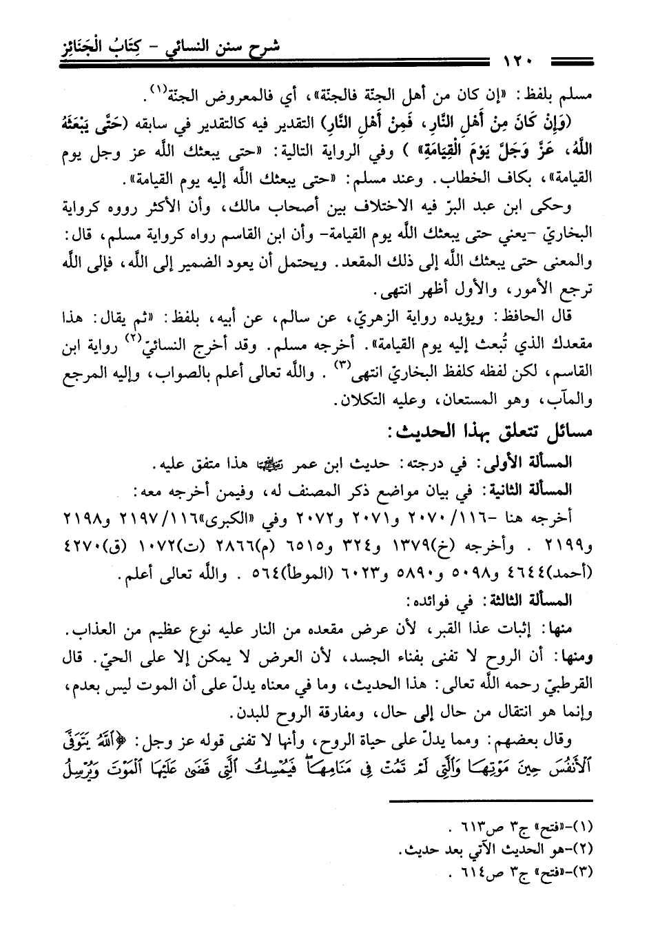 قال الحافظ: ويؤيده رواية الزهريّ، عن سالم، عن أبيه، بلفظ: "ثم يقال: هذا مقعدك الذي تُبعث إليه يوم القيامة". أخرجه مسلم. وقد أخرج النسائيّ (¬2) رواية ابن القاسم، لكن لفظه كلفظ البخاريّ انتهى (¬3). واللَّه تعالى أعلم بالصواب، وإليه المرجع والمآب، وهو المستعان، وعليه التكلان.