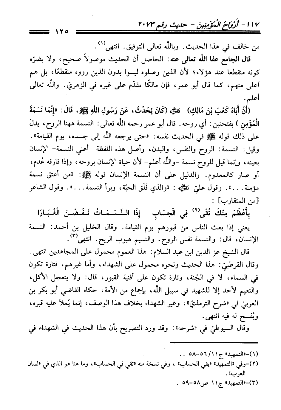 (أَنَّ أَبّاهُ كَعْبَ بْنَ مَالِكٍ) - رضي اللَّه عنه - (كانَ يُحَدِّثُ، عَنْ رَسُولِ اللَّهِ - صلى اللَّه عليه وسلم -، قَالَ: "إِنَّمَا نَسَمَةُ الْمُؤْمِنِ) بفتحتين: أي روحه. قال أبو عمر -رَحِمَهُ اللَّهُ تَعَالَى-: النسمة ههنا الروح، يدلّ على ذلك قوله - صلى اللَّه عليه وسلم - في الحديث نفسه: "حتى يرجعه اللَّه إلى جسده، يوم القيامة". وقيل: النسمة: الروح والنفس، والبدن، وأصل هذه اللفظة -أعني النسمة- الإنسان بعينه، وإنما قيل للروح نسمة -اللَّه أعلم- لأن حياة الإنسان بروحه، وإذا فارقه عُدم، أو صار كالمعدوم. والدليل على أن النسمة الإنسان قوله - صلى اللَّه عليه وسلم -: "من أعتق نسمة