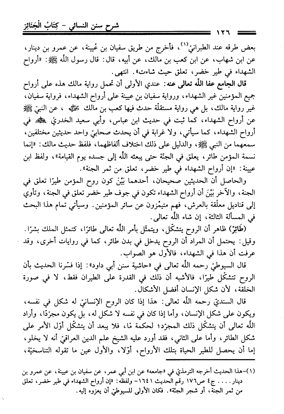 قال السيوطيّ -رَحِمَهُ اللَّهُ تَعَالَى- في "حاشية سنن أبي داود": إذا فسّرنا الحديث بأن الروح تتشكّل طيرًا، فالأشبه أن ذلك في القدرة على الطيران فقط، لا في صورة الخلقة، لأن شكل الإنسان أفضل الأشكال.