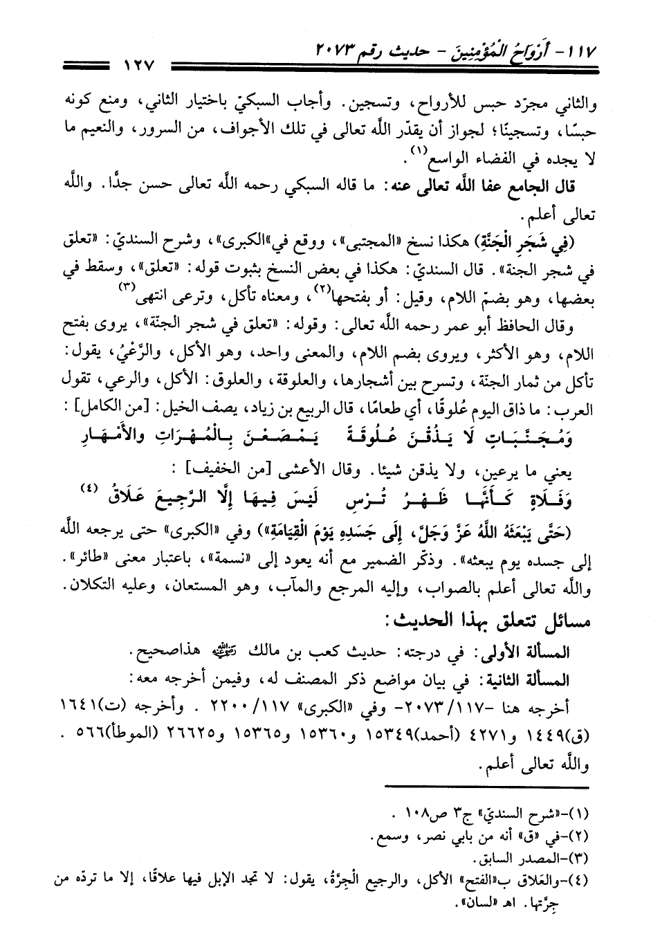 (فِي شَجَرِ الْجَنَّةِ) هكذا نسخ "المجتبى"، ووقع في "الكبرى"، وشرح السنديّ: "تعلق في شجر الجنة". قال السنديّ: هكذا في بعض النسخ بثبوت قوله: "تعلق"، وسقط في بعضها، وهو بضمّ اللام، وقيل: أو بفتحها (¬2)، ومعناه تأكل، وترعى انتهى (¬3)