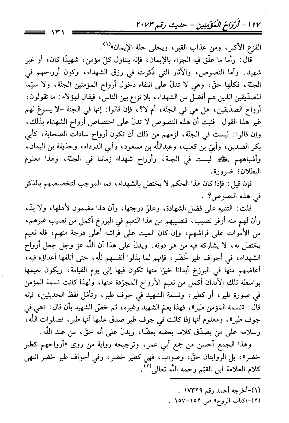 وهذا الجمع أحسن من جمع أبي عمر، وترجيحه رواية من روى "أرواحهم كطير خضر"، بل الروايتان حقّ، وصواب، فهي كطير خضر، وفي أجواف طير خضر انتهى كلام العلامة ابن القيم -رَحِمَهُ اللَّهُ تَعَالَى- (¬2).